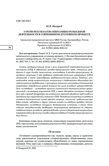 Статья посвящена анализу места и роли результатов оперативно-розыскной деятельности (ОРД) в современном уголовно-процессуальном праве. Соотнесены устоявшиеся в науке взгляды относительно использования в уголовно-процессуальном доказывании полученных в ходе проведения оперативно-розыскных мероприятий (ОРМ) материалов, а также существующие правоприменительные реалии. Выявлены несоответствия между теоретическими положениями и выдвигаемыми объективной действительностью требованиями к расширению практики использования возможностей оперативных подразделений органов дознания для целей уголовного судопроизводства. Цели исследования — установить причины скептического отношения ученых-процессуалистов к институту результатов ОРД, а также обосновать положения о ведущей роли суда и органов прокуратуры как независимых гарантов соблюдения прав человека и гражданина при осуществлении отдельных ОРМ. Методологическую базу исследования составили диалектический метод научного познания, логический, сравнительно-правовой методы, наблюдение и другие частные методы исследования правовых явлений. Материалами исследования послужили доктринальные источники, а также отечественное законодательство. Выдвинуты концептуальные предложения по совершенствованию теории уголовного судопроизводства с целью ее рациональной актуализации, охарактеризованы возможные способы совершенствования Уголовно-процессуального кодекса России
