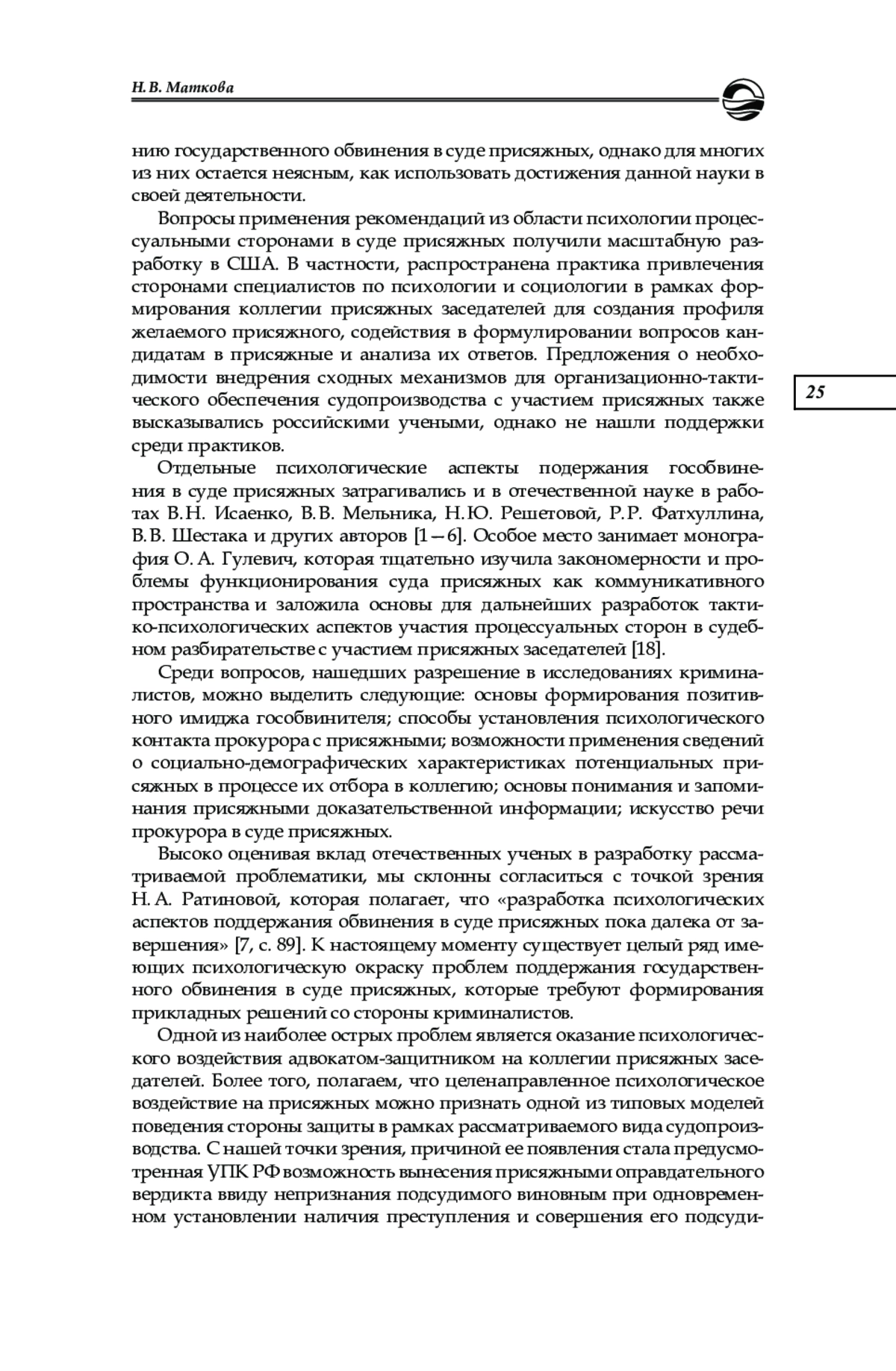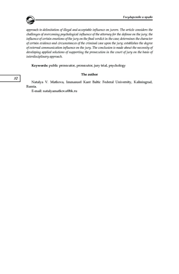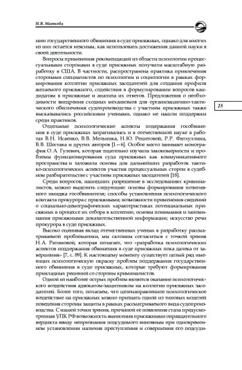 7. Ратинова Н. А. Психологические особенности деятельности прокурора при рассмотрении уголовных дел в суде с участием коллегии присяжных заседателей // Вестник Академии Генеральной прокуратуры Российской Федерации. 2015. № 5 (49). С. 89-95. EDN: UYYKYR