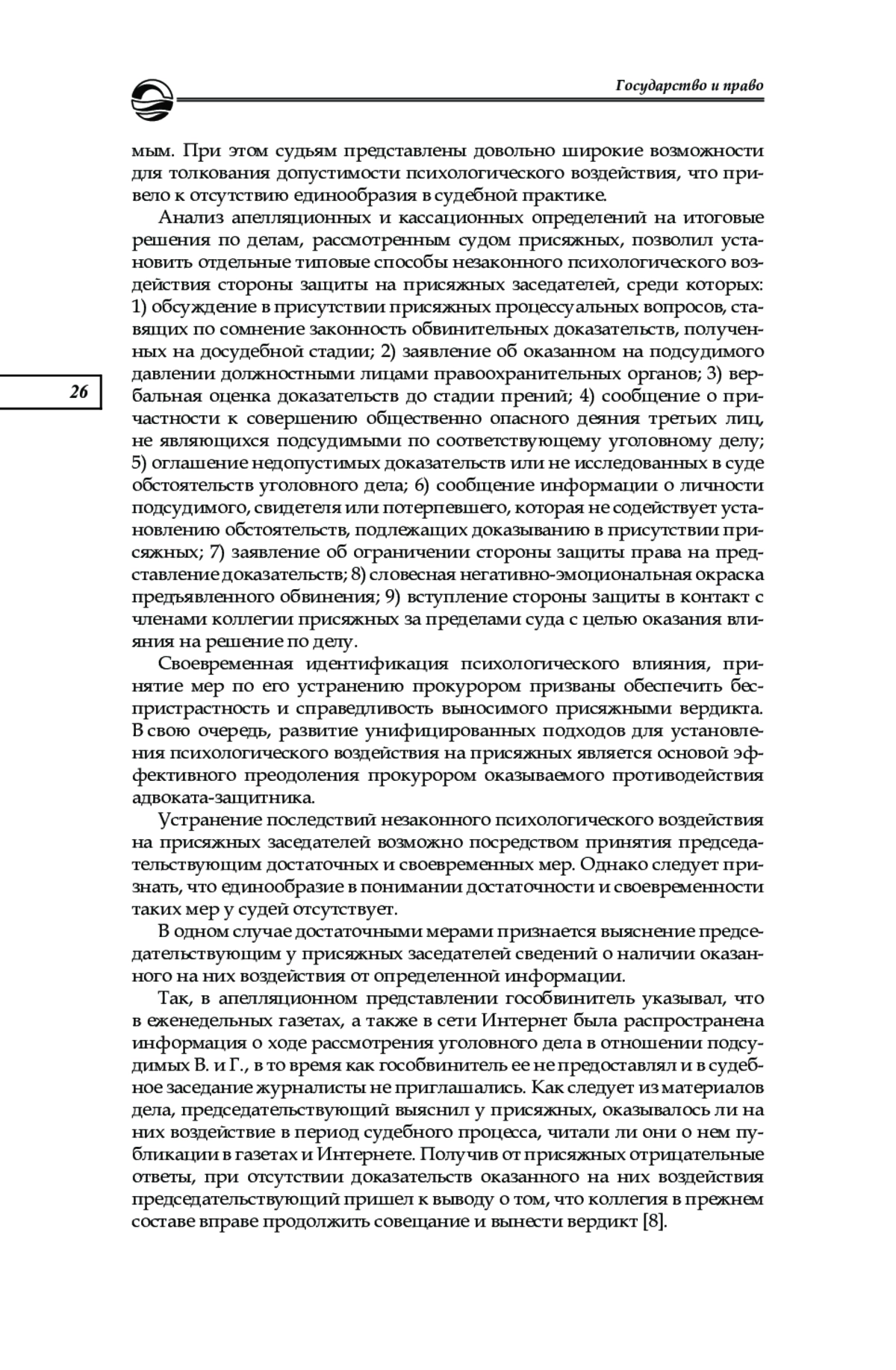 12. Пичугин В. Г. Проблема психологического влияния на присяжных заседателей // Медицина. Социология. Философия. Прикладные исследования. 2019. № 1. С. 159-162. EDN: VWIXXP
