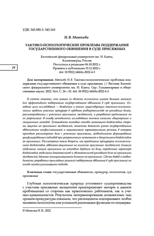 1. Исаенко В. Н. Тактико-психологические аспекты представления прокурором доказательств в суде с участием присяжных заседателей // Криминалистъ. 2018. № 2 (23). С. 18-22. EDN: YATJDV