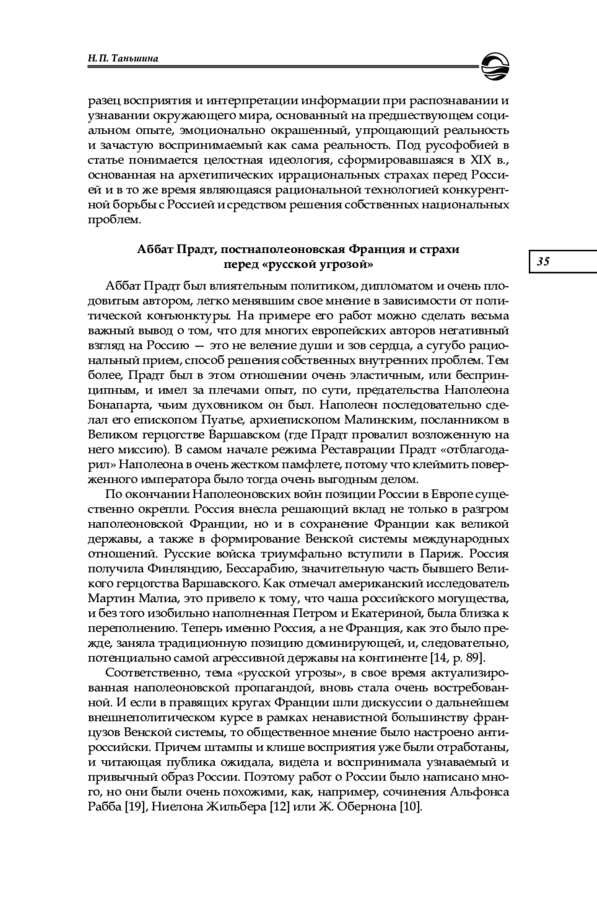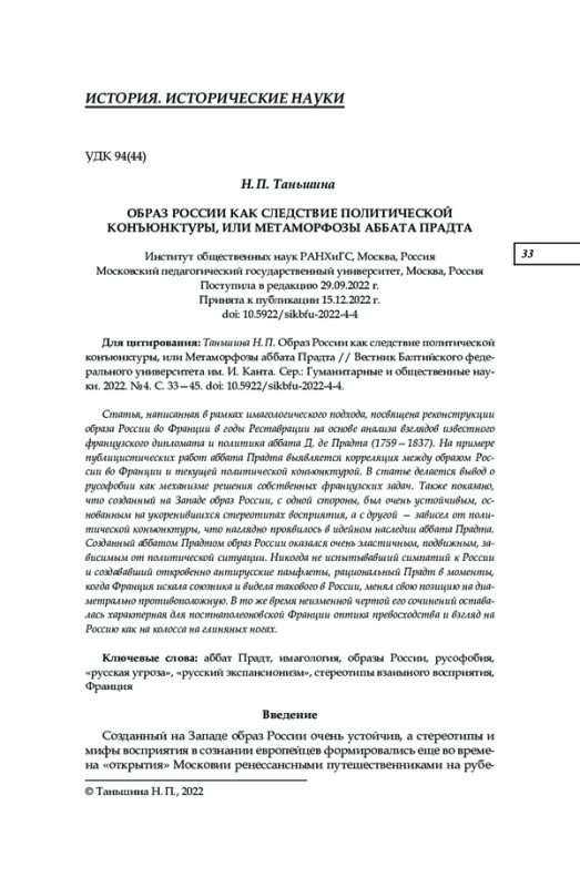 Статья, написанная в рамках имагологического подхода, посвящена реконструкции образа России во Франции в годы Реставрации на основе анализа взглядов известного французского дипломата и политика аббата Д. де Прадта (1759—1837). На примере публицистических работ аббата Прадта выявляется корреляция между образом России во Франции и текущей политической конъюнктурой. В статье делается вывод о русофобии как механизме решения собственных французских задач. Также показано, что созданный на Западе образ России, с одной стороны, был очень устойчивым, основанным на укоренившихся стереотипах восприятия, а с другой — зависел от политической конъюнктуры, что наглядно проявилось в идейном наследии аббата Прадта. Созданный аббатом Прадтом образ России оказался очень эластичным, подвижным, зависимым от политической ситуации. Никогда не испытывавший симпатий к России и создававший откровенно антирусские памфлеты, рациональный Прадт в моменты, когда Франция искала союзника и видела такового в России, менял свою позицию на диаметрально противоположную. В то же время неизменной чертой его сочинений оставалась характерная для постнаполеоновской Франции оптика превосходства и взгляд на Россию как на колосса на глиняных ногах