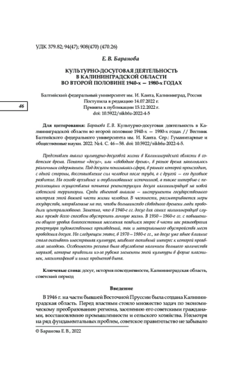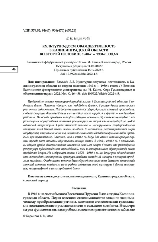 Представлен анализ культурно-досуговой жизни в Калининградской области в советское время. Понятие «досуг», или «свободное время», в разное время наполнялось различным содержанием. Под досугом понималась сфера, в рамках которой происходит, с одной стороны, восстановление сил человека после труда, а с другой — его духовное развитие. На основе архивных и опубликованных источников, а также интервью с переселенцами осуществлена попытка реконструкции досуга калининградцев на новой советской территории. Среди объектов анализа — инструменты государственного контроля этой важной части жизни человека. В частности, рассматриваются меры государства, направленные на то, чтобы большинство свободного времени люди проводили централизованно. Заметно, что в 1940-е гг. досуг для самих калининградцев служил прежде всего способом обустроить личную жизнь. В 1950—1960-е гг. с повышением общего уровня благосостояния населения появился запрос в части как разнообразия репертуара художественных произведений, так и материального обустройства мест проведения досуга. На следующем этапе, в 1970—1980-е гг., на досуг уже явное влияние стала оказывать иностранная культура, наиболее активный интерес к которой проявляла молодежь. Особенность региона была обусловлена наличием большего количества моряков, которые привозили из-за рубежа элементы этой культуры в форме пластинок, магнитофонов и иных предметов быта