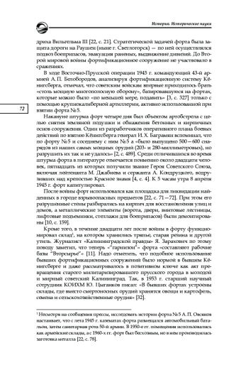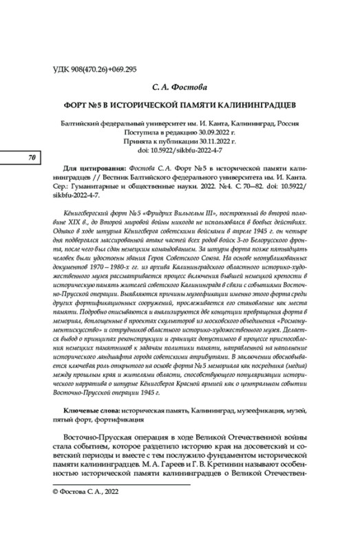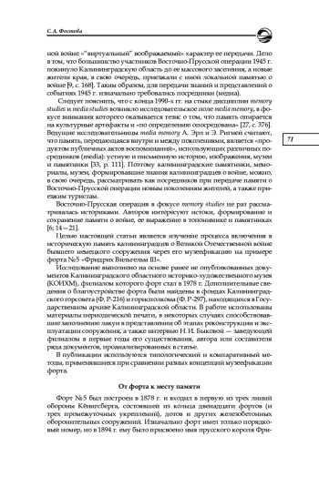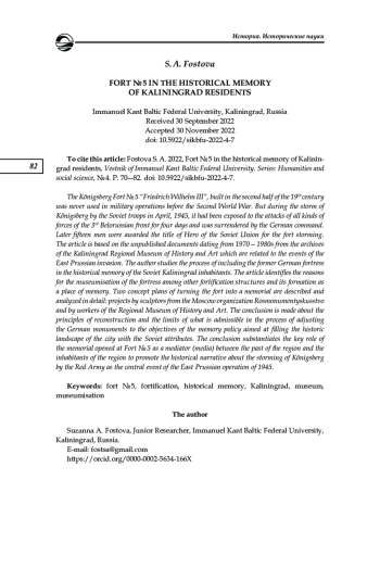 Кёнигсбергский форт No 5 «Фридрих Вильгельм III», построенный во второй половине XIX в., до Второй мировой войны никогда не использовался в боевых действиях. Однако в ходе штурма Кёнигсберга советскими войсками в апреле 1945 г. он четыре дня подвергался массированной атаке частей всех родов войск 3-го Белорусского фронта, после чего был сдан немецким командованием. За штурм форта позже пятнадцать человек были удостоены звания Героя Советского Союза. На основе неопубликованных документов 1970—1980-х гг. из архива Калининградского областного историко-художественного музея рассматривается процесс включения бывшей немецкой крепости в историческую память жителей советского Калининграда в связи с событиями Восточно-Прусской операции. Выявляются причины музеефикации именно этого форта среди других фортификационных сооружений, прослеживается его становление как места памяти. Подробно описываются и анализируются две концепции превращения форта в мемориал, воплощенные в проектах скульпторов из московского объединения «Росмонументискусство» и сотрудников областного историко-художественного музея. Делается вывод о принципах реконструкции и границах допустимого в процессе приспособления немецких памятников к задачам политики памяти, направленной на наполнение исторического ландшафта города советскими атрибутами. В заключении обосновывается ключевая роль открытого на основе форта No 5 мемориала как посредника (медиа) между прошлым края и жителями области, способствующего популяризации исторического нарратива о штурме Кёнигсберга Красной армией как о центральном событии Восточно-Прусской операции 1945 г