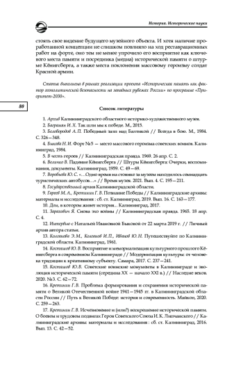 15. Костяшов Ю. В. Советские воинские монументы в Калининграде и эволюция исторической памяти (середина XX - начало XXI в.) // Наследие веков. 2020. № 3. С. 62-72. EDN: PAUFLV