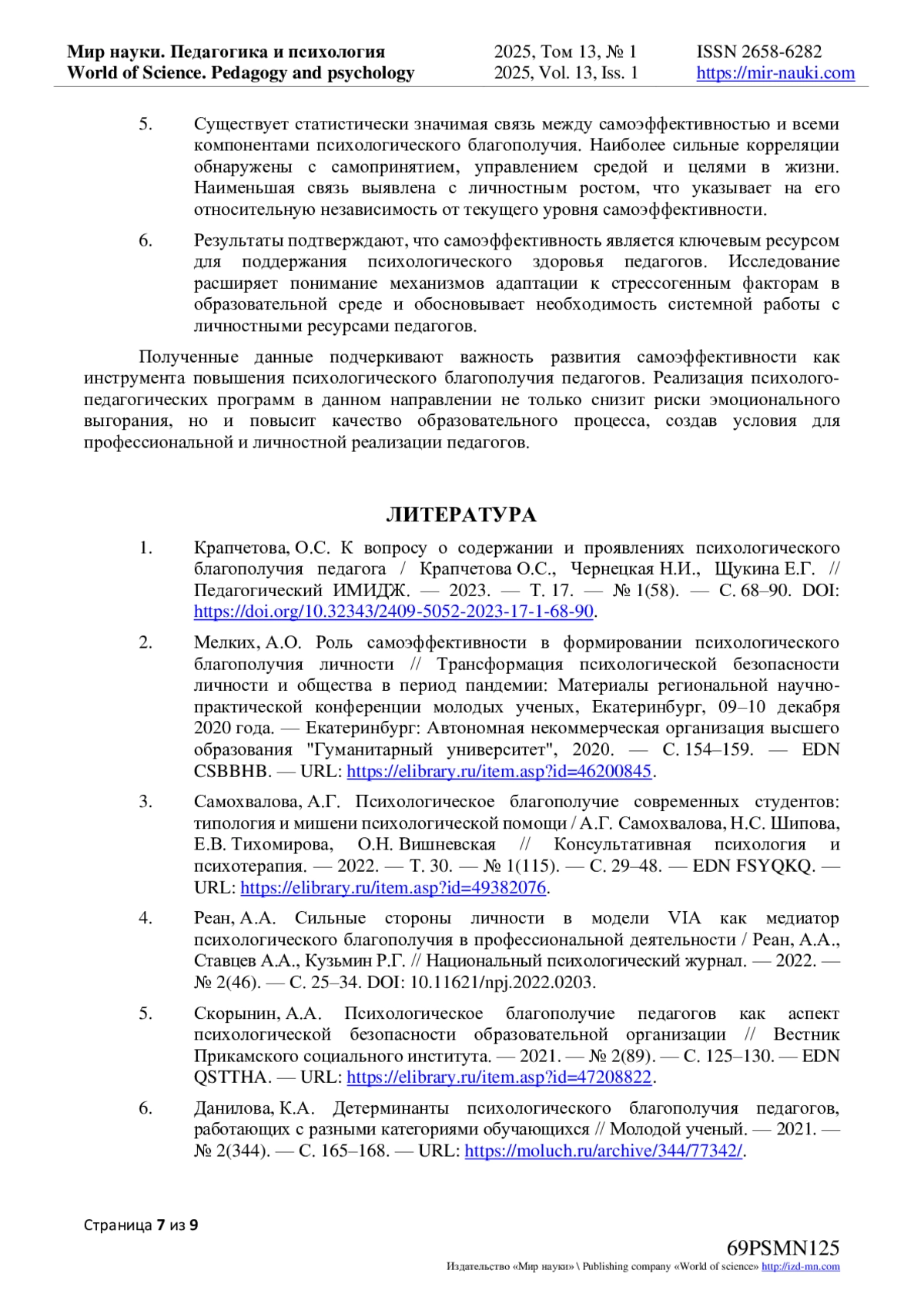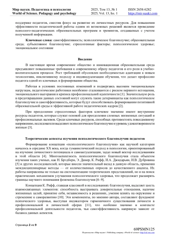 5. Скорынин, А.А. Психологическое благополучие педагогов как аспект психологической безопасности образовательной организации // Вестник Прикамского социального института. - 2021. - № 2(89). - С. 125-130. - URL: item.asp?id=47208822. EDN: QSTTHA