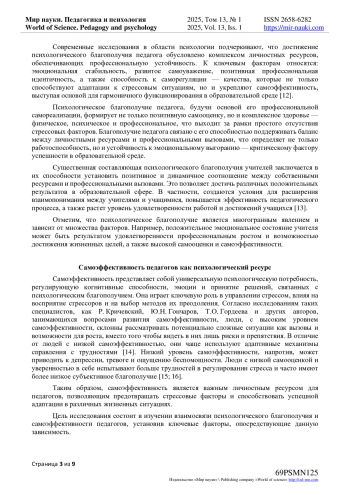 В статье рассматривается взаимосвязь между психологическим благополучием и самоэффективностью педагогов как ключевых факторов, влияющих на их профессиональную успешность, эмоциональную устойчивость и удовлетворенность работой. В работе исследуются теоретические основы изучения психологического благополучия педагогов, рассматриваемого как фундамент их профессиональной реализации. Данный феномен не только способствует формированию адекватной самооценки, но и оказывает комплексное влияние на психическое и эмоциональное здоровье. Отдельное внимание уделяется самоэффективности педагогов как ключевому психологическому ресурсу. Авторы подчеркивают, что эта характеристика выполняет регуляторную функцию, воздействуя на когнитивные процессы, эмоциональные реакции и принятие решений, что в совокупности определяет уровень психологического благополучия. В статье обосновывается универсальность самоэффективности как потребности, которая интегрируется в профессиональные и личностные аспекты жизни педагога, выступая механизмом адаптации к вызовам образовательной среды. Авторы подчеркивают актуальность данной темы в контексте современных вызовов системы образования, где высокий уровень стресса и эмоционального выгорания среди педагогов требует поиска ресурсов для их преодоления. В ходе исследования, основанных на данных опроса 100 педагогических работников, были выявлены статистически значимые корреляции, которые указывают на существенные связи между психологическим благополучием и самоэффективностью. Полученные результаты имеют большое значение для развития педагогической науки и практики, так как акцентируют внимание на важности развития данной компетенции у преподавателей. Они позволяют переосмыслить подходы к поддержке педагогов, сместив фокус на развитие их личностных ресурсов. Для повышения эффективности педагогической работы одним из возможных решений является проведение психолого-педагогических образовательных программ и тренингов, создаваемых с учетом полученной информации.