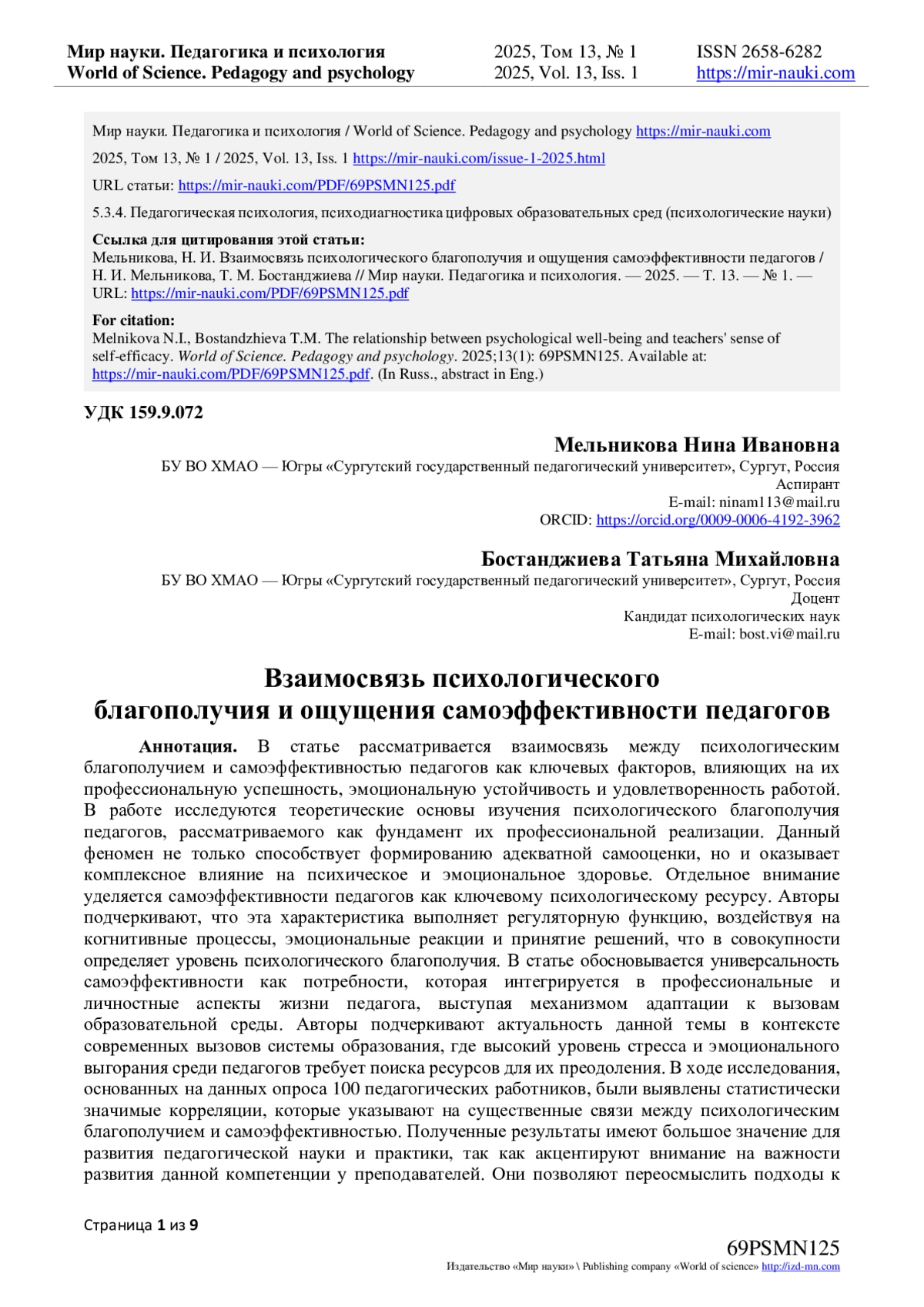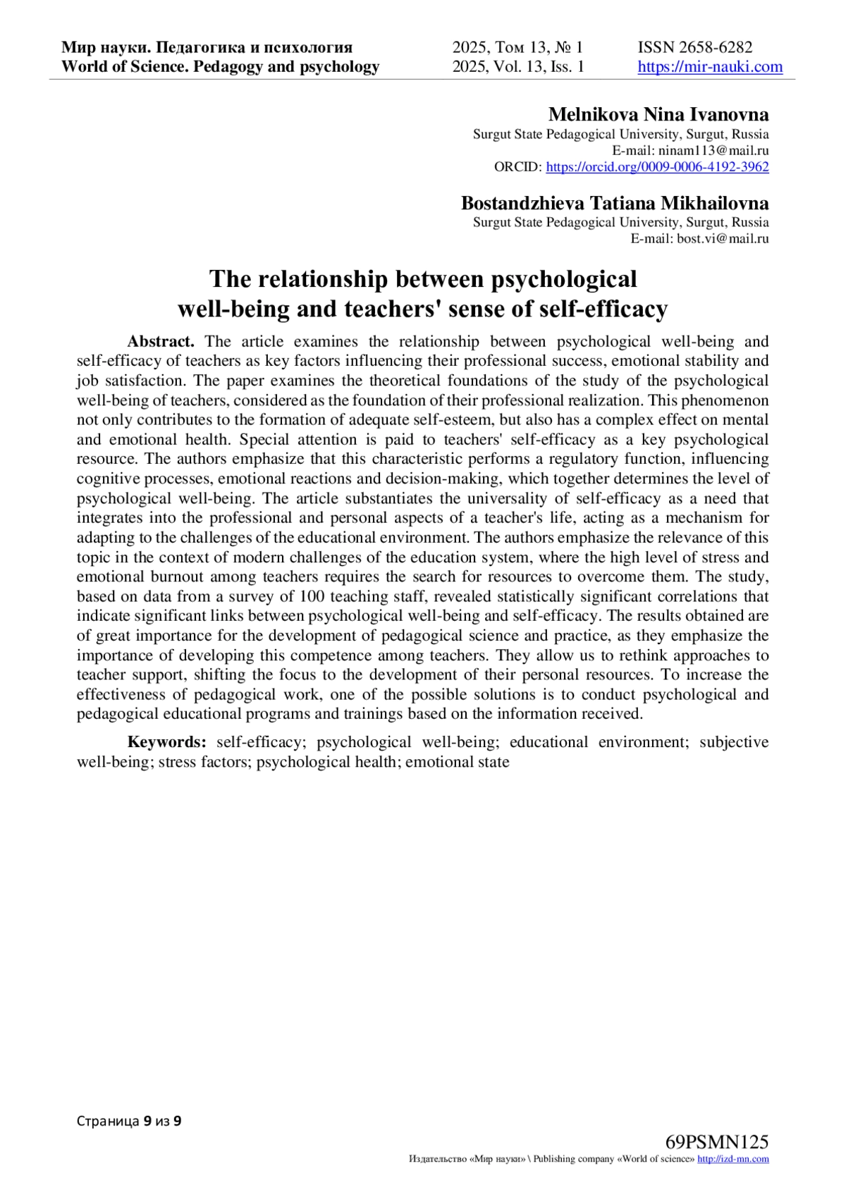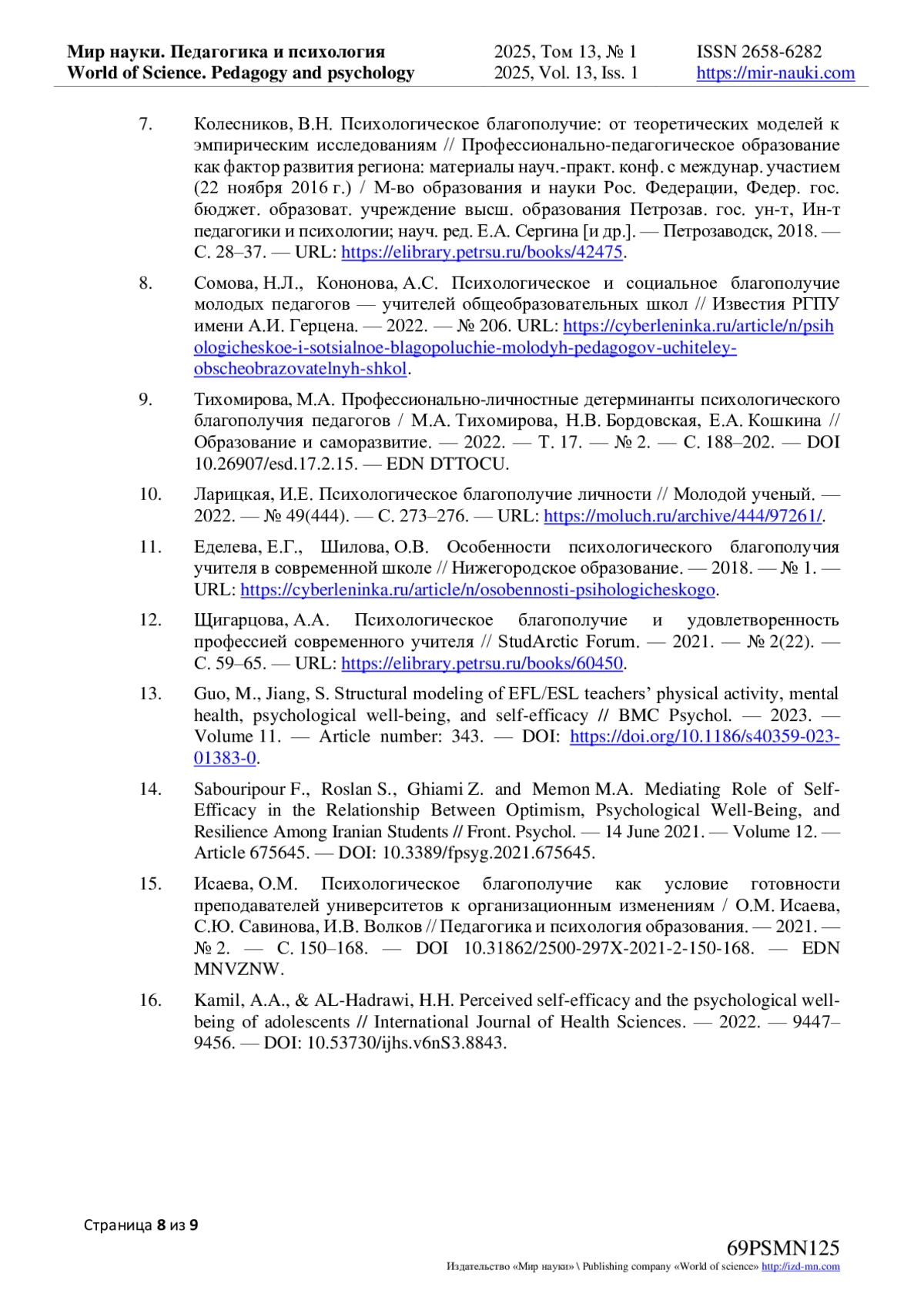 9. Тихомирова, М.А. Профессионально-личностные детерминанты психологического благополучия педагогов / М.А. Тихомирова, Н.В. Бордовская, Е.А. Кошкина // Образование и саморазвитие. - 2022. - Т. 17. - № 2. - С. 188-202. DOI: 10.26907/esd.17.2.15 EDN: DTTOCU