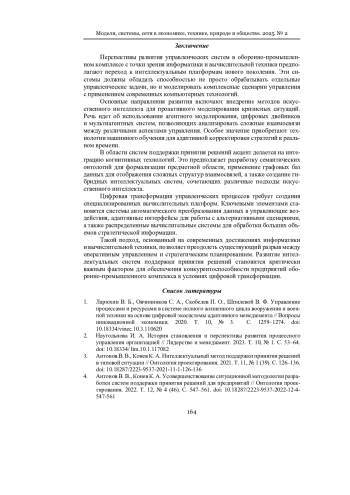 1. Ларюхин В. Б., Овчинников С. А., Скобелев П. О., Шпилевой В. Ф. Управление процессами и ресурсами в системе полного жизненного цикла вооружения и военной техники на основе цифровой экосистемы адаптивного менеджмента // Вопросы инновационной экономики. 2020. Т. 10, № 3. С. 1259-1274. DOI: 10.18334/vinec.10.3.110620 EDN: DONCEB