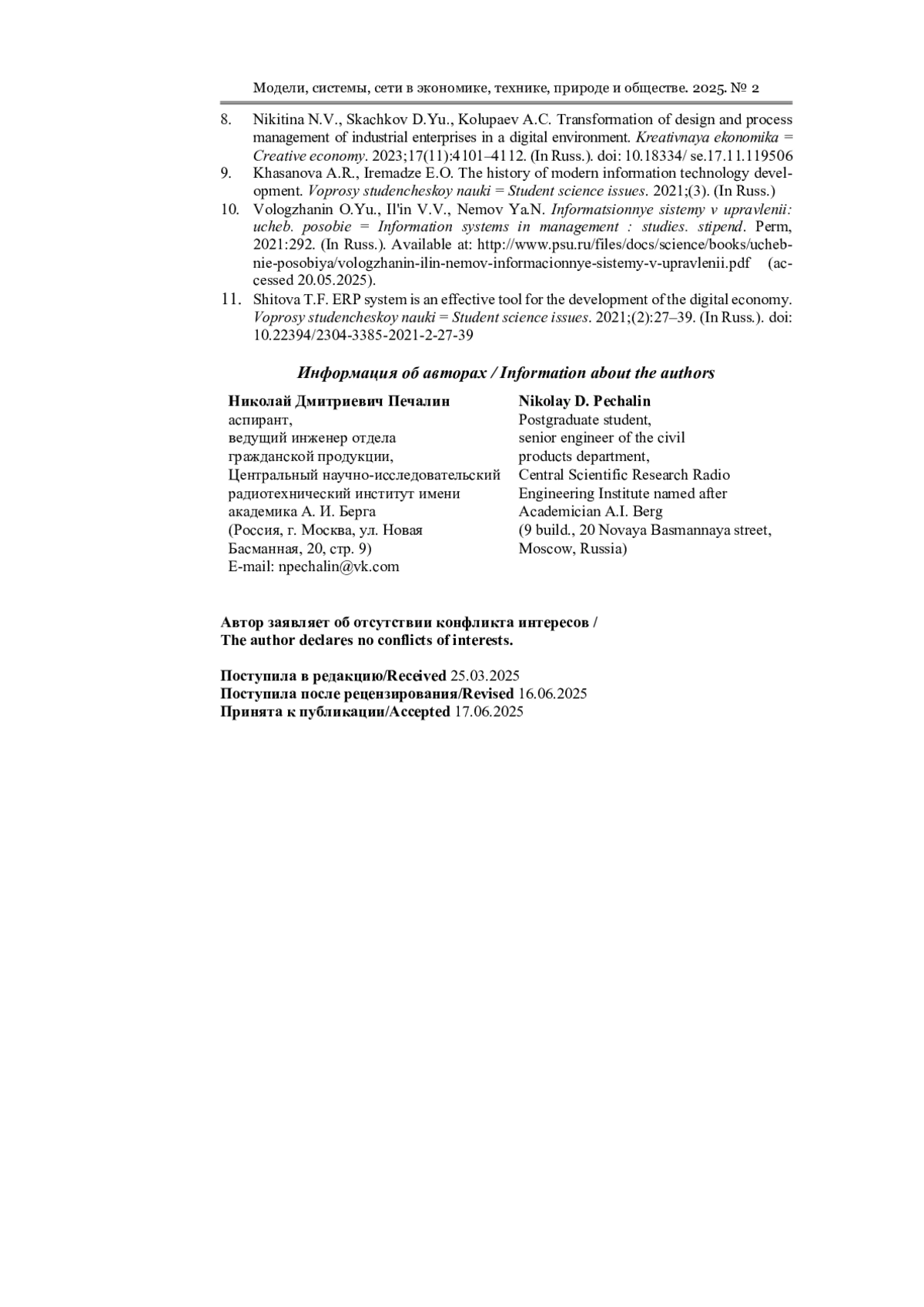 8. Никитина Н. В., Скачков Д. Ю., Колупаев A. C. Трансформация проектно-процессного управления промышленными предприятиями в условиях цифровой среды // Креативная экономика. 2023. Т. 17, № 11. С. 4101-4112. doi: 10.18334/ се.17.11.119506. EDN: UCPWDX