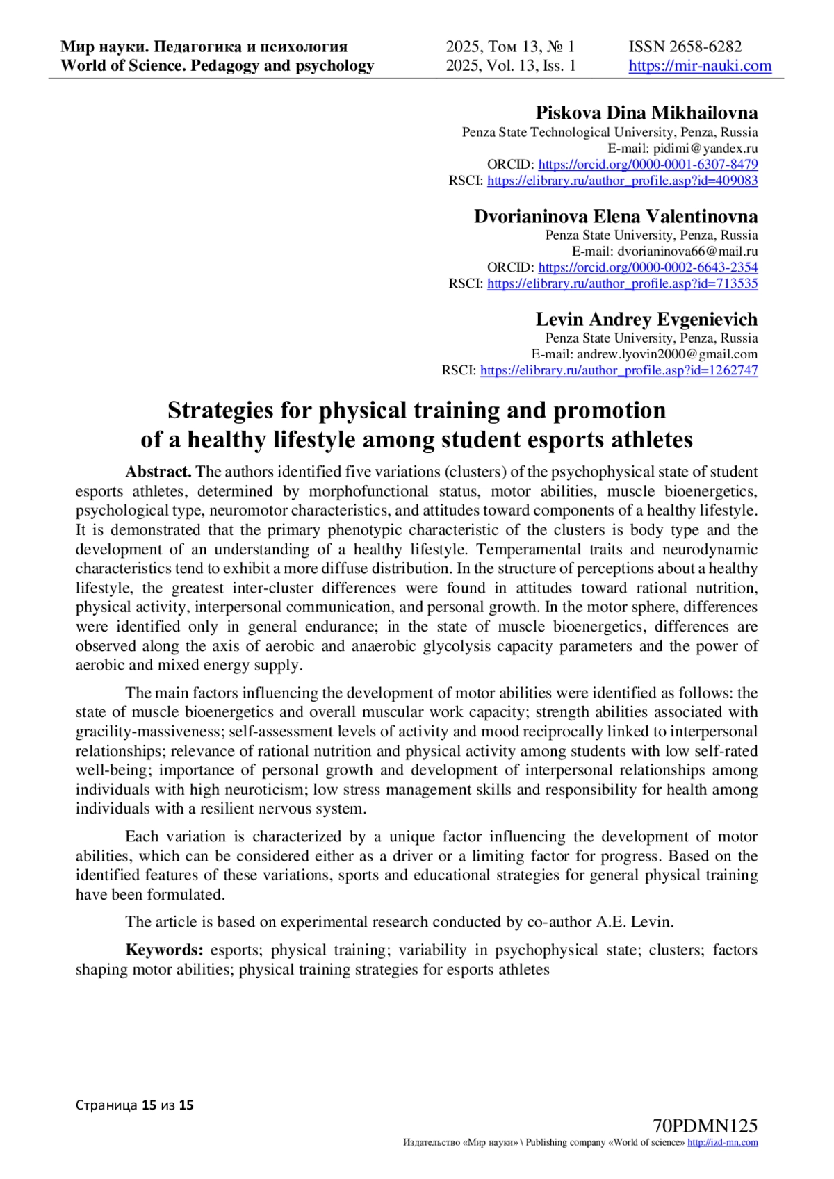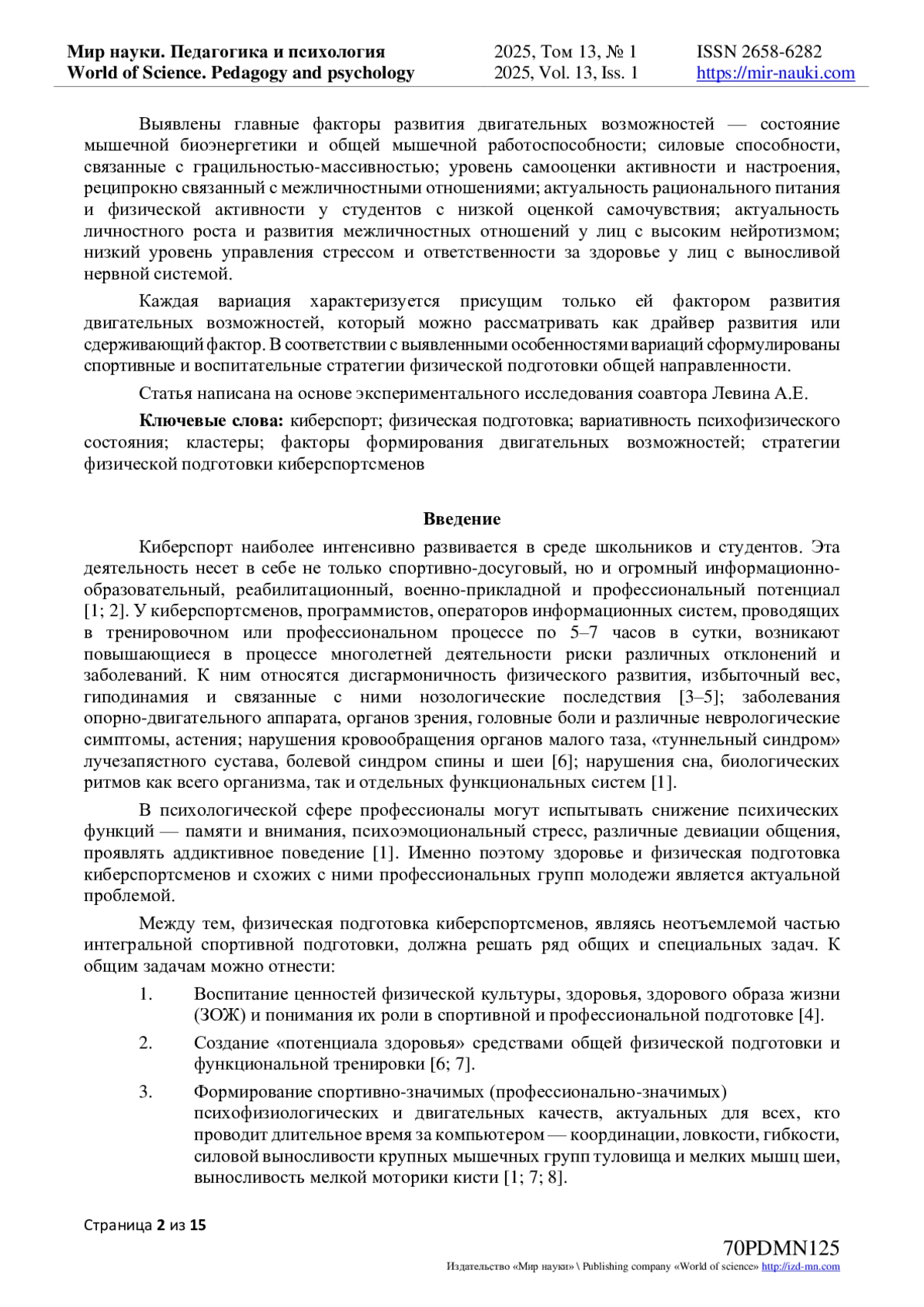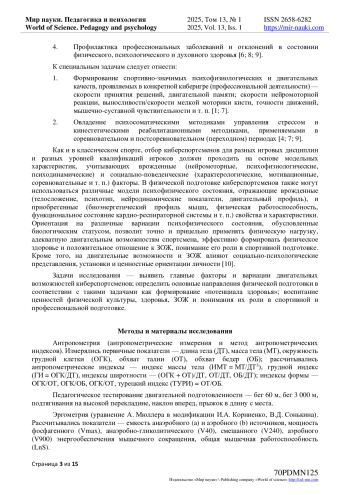 Авторами выделены пять вариаций (кластеров) психофизического состояния студентов-киберспорсменов, обусловленные морфофункциональным статусом, двигательными способностями, мышечной биоэнергетикой, психотипом, нейромоторными характеристиками, отношением к составляющим здорового образа жизни. Показано, что основной фенотипической характеристикой кластеров является тип телосложения и сформированность понимания здорового образа жизни. Свойства темперамента и нейродинамические характеристики имеют тенденцию к более диффузному распределению. В структуре представления о здоровом образе жизни максимальные межкластерные различия выявлены в отношении к рациональному питанию, физической активности, межличностному общению и личностному росту. В двигательной сфере различия лишь в общей выносливости; в состоянии мышечной биоэнергетики различия проходят по оси параметров емкости аэробного и анаэробного гликолиза и мощности аэробного и смешанного энергообеспечения. Выявлены главные факторы развития двигательных возможностей - состояние мышечной биоэнергетики и общей мышечной работоспособности; силовые способности, связанные с грацильностью-массивностью; уровень самооценки активности и настроения, реципрокно связанный с межличностными отношениями; актуальность рационального питания и физической активности у студентов с низкой оценкой самочувствия; актуальность личностного роста и развития межличностных отношений у лиц с высоким нейротизмом; низкий уровень управления стрессом и ответственности за здоровье у лиц с выносливой нервной системой. Каждая вариация характеризуется присущим только ей фактором развития двигательных возможностей, который можно рассматривать как драйвер развития или сдерживающий фактор. В соответствии с выявленными особенностями вариаций сформулированы спортивные и воспитательные стратегии физической подготовки общей направленности. Статья написана на основе экспериментального исследования соавтора Левина А. Е.