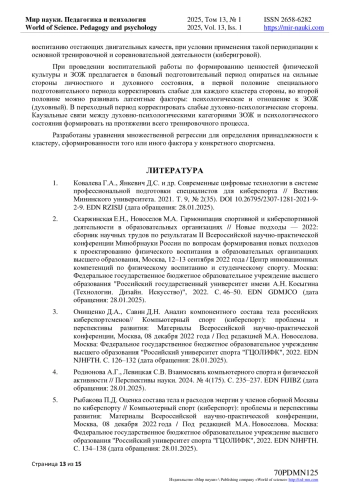 1. Ковалева Г.А., Янкевич Д.С. и др. Современные цифровые технологии в системе профессиональной подготовки специалистов для киберспорта // Вестник Мининского университета. 2021. Т. 9, № 2(35). (дата обращения: 28.01.2025). DOI: 10.26795/2307-1281-2021-9-2-9 EDN: RZISIJ