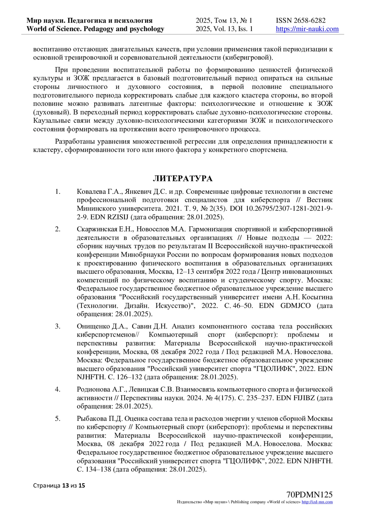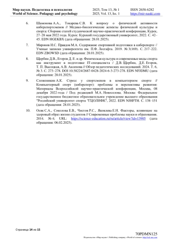 2. Скаржинская Е.Н., Новоселов М.А. Гармонизация спортивной и киберспортивной деятельности в образовательных организациях // Новые подходы - 2022: сборник научных трудов по результатам II Всероссийской научно-практической конференции Минобрнауки России по вопросам формирования новых подходов к проектированию физического воспитания в образовательных организациях высшего образования, Москва, 12-13 сентября 2022 года / Центр инновационных компетенций по физическому воспитанию и студенческому спорту. Москва: Федеральное государственное бюджетное образовательное учреждение высшего образования “Российский государственный университет имени А.Н. Косыгина (Технологии. Дизайн. Искусство)”, 2022. С. 46-50. (дата обращения: 28.01.2025). EDN: GDMJCO