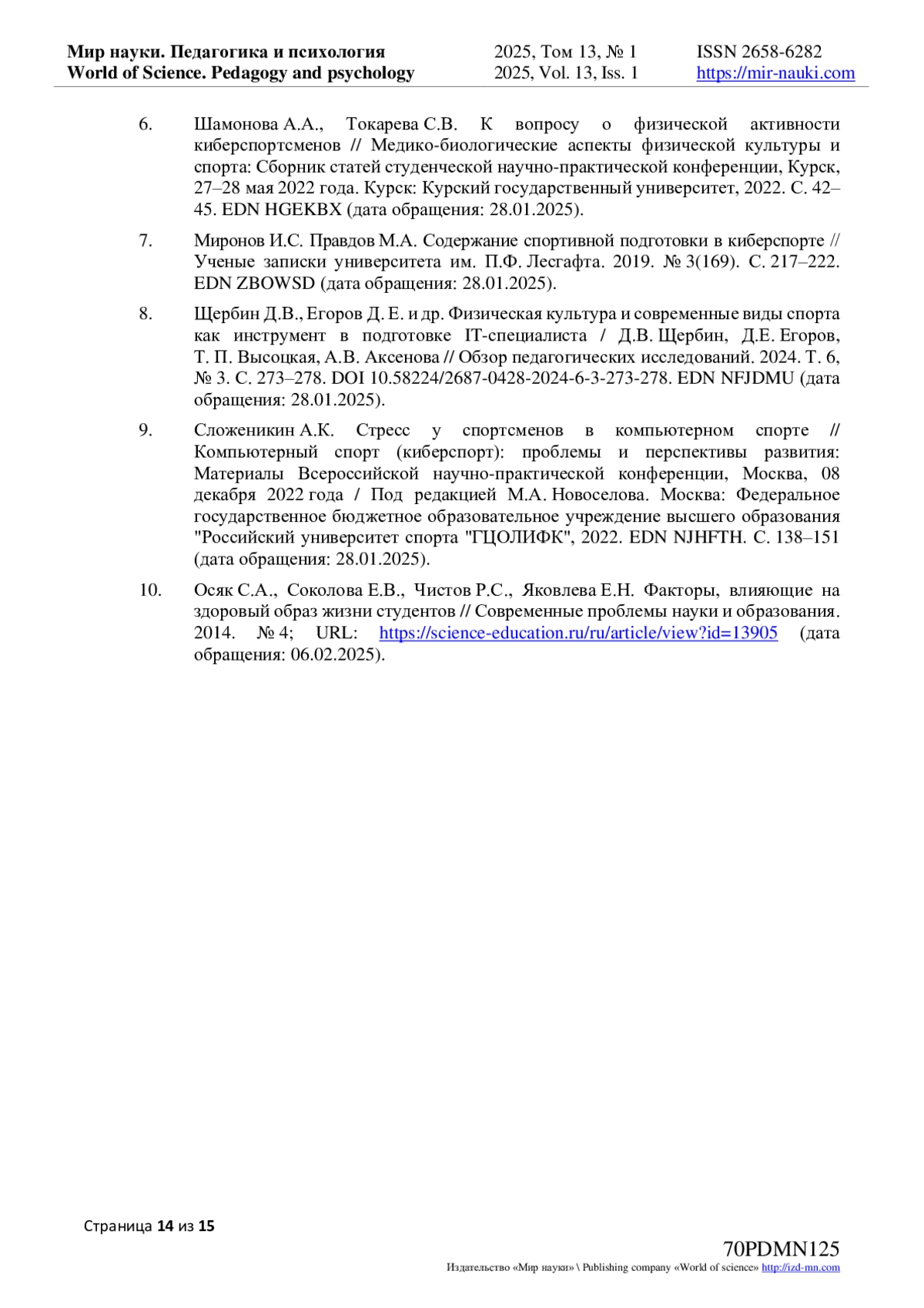 10. Осяк С.А., Соколова Е.В., Чистов Р.С., Яковлева Е.Н. Факторы, влияющие на здоровый образ жизни студентов // Современные проблемы науки и образования. 2014. № 4; URL: https://science-education.ru/ru/article/view?id=13905 (дата обращения: 06.02.2025). EDN: STRLBX