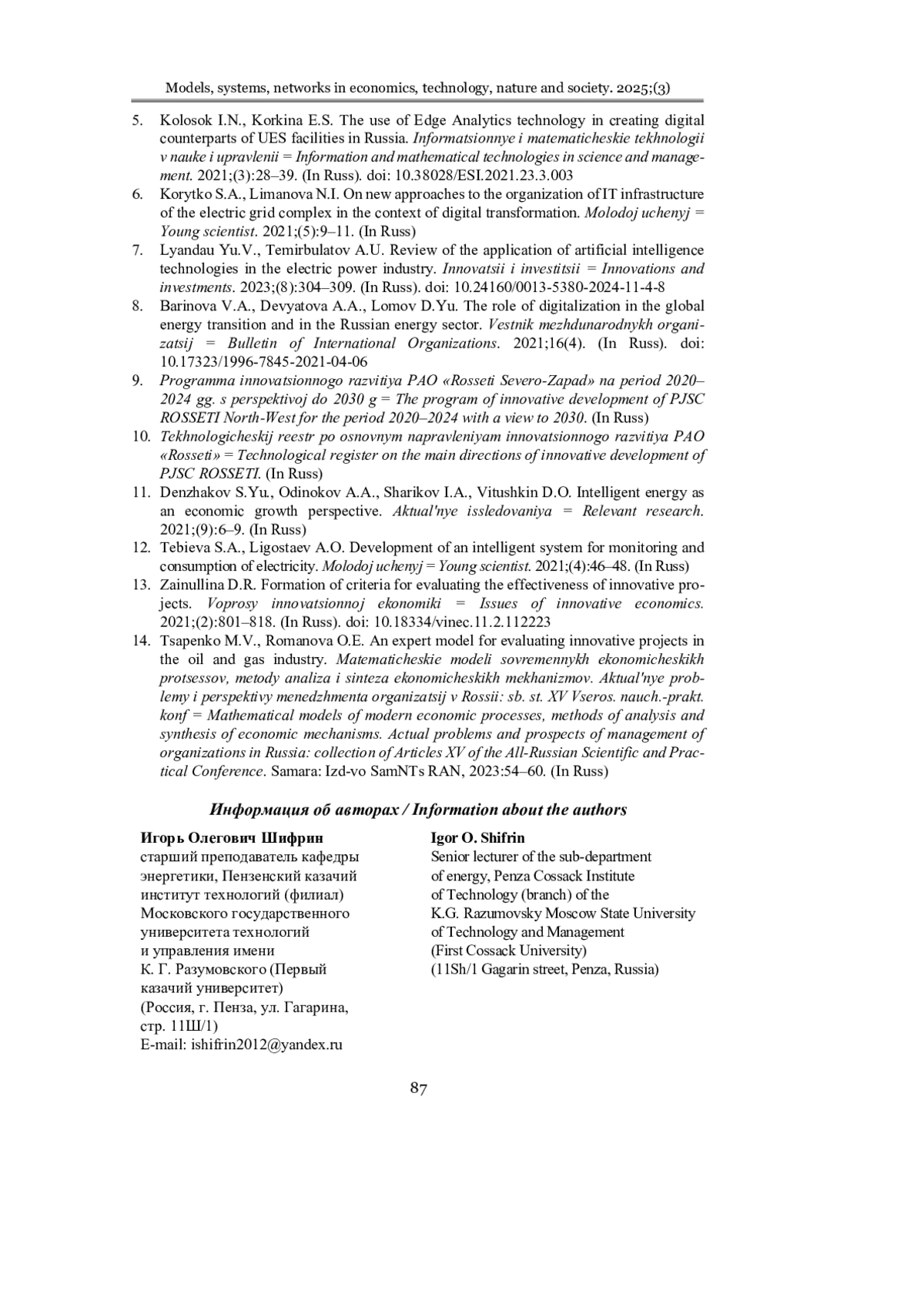 11. Деньжаков С. Ю., Одиноков А. А., Шариков И. А., Витушкин Д. О. Интеллектуальная энергетика как перспектива роста экономики // Актуальные исследования. 2021. № 9 (36). С. 6-9. EDN: PXWJUB