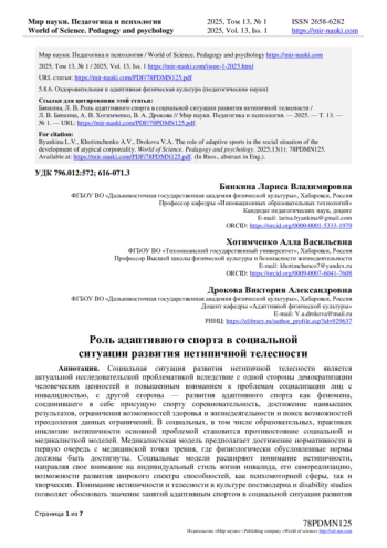 13. Лукьянова А.А. Специфика социально-культурного конструирования нетипичной телесности в инклюзивном образовании / А.А. Лукьянова, А.А. Шавлохова, Е.В. Фелл // Вестник Томского государственного университета. Культурология и искусствоведение. - 2021. - № 43. - С. 116-125. - -. DOI: 10.17223/22220836/43/8 EDN: BNOZTT