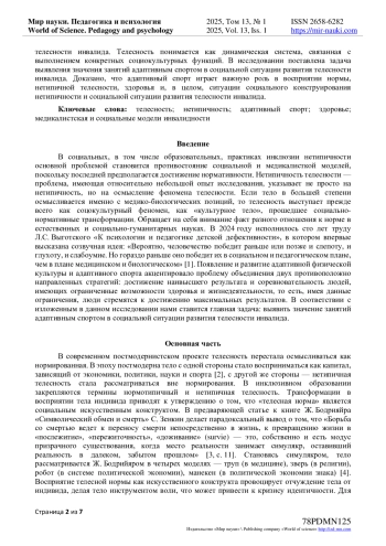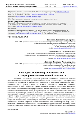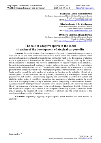Социальная ситуация развития нетипичной телесности является актуальной исследовательской проблематикой вследствие с одной стороны демократизации человеческих ценностей и повышенным вниманием к проблемам социализации лиц с инвалидностью, с другой стороны - развития адаптивного спорта как феномена, соединившего в себе присущую спорту соревновательность, достижение наивысших результатов, ограничения возможностей здоровья и жизнедеятельности и поиск возможностей преодоления данных ограничений. В социальных, в том числе образовательных, практиках инклюзии нетипичности основной проблемой становится противостояние социальной и медикалисткой моделей. Медикалистская модель предполагает достижение нормативности в первую очередь с медицинской точки зрения, где физиологически обусловленные нормы должны быть достигнуты. Социальные модели расширяют понимание нетипичности, направляя свое внимание на индивидуальный стиль жизни инвалида, его самореализацию, возможности развития широкого спектра способностей, как психомоторной сферы, так и творческих. Понимание нетипичности и телесности в культуре постмодерна и disability studies позволяет обосновать значение занятий адаптивным спортом в социальной ситуации развития телесности инвалида. Телесность понимается как динамическая система, связанная с выполнением конкретных социокультурных функций. В исследовании поставлена задача выявления значения занятий адаптивным спортом в социальной ситуации развития телесности инвалида. Доказано, что адаптивный спорт играет важную роль в восприятии нормы, нетипичной телесности, здоровья и, в целом, ситуации социального конструирования нетипичности и социальной ситуации развития телесности инвалида.