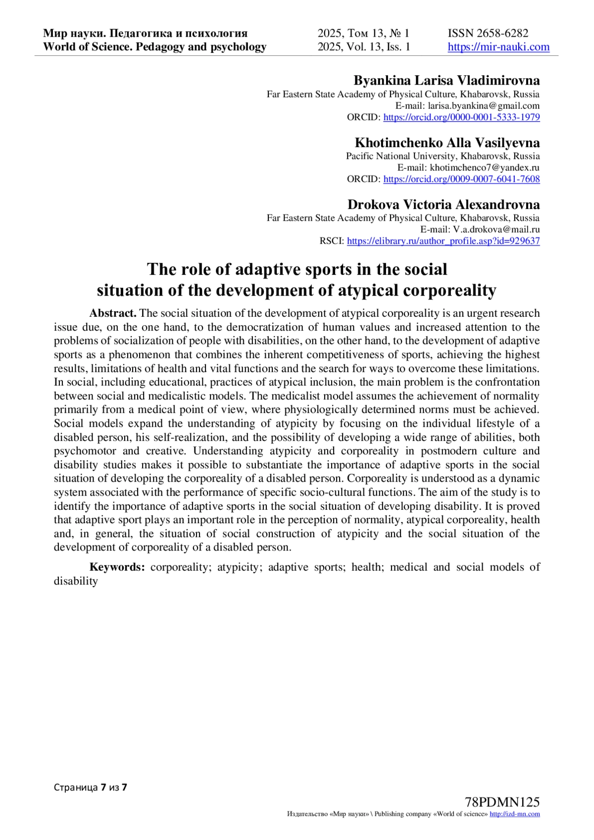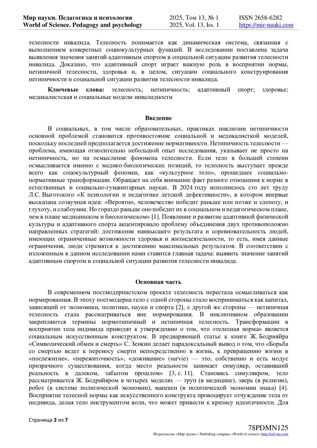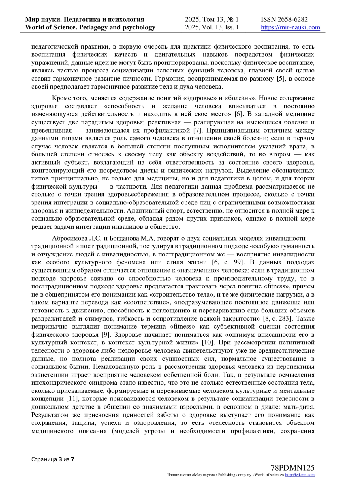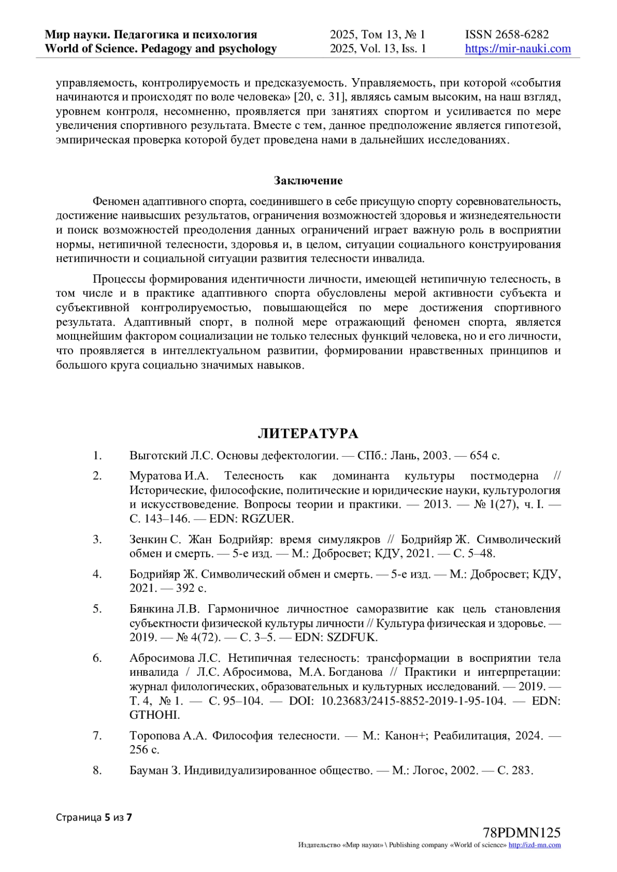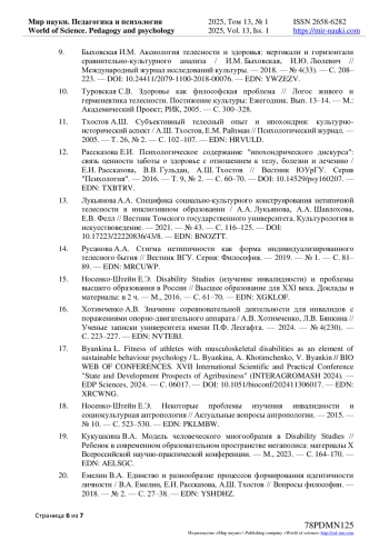 6. Абросимова Л.С. Нетипичная телесность: трансформации в восприятии тела инвалида / Л.С. Абросимова, М.А. Богданова // Практики и интерпретации: журнал филологических, образовательных и культурных исследований. - 2019. - Т. 4, № 1. - С. 95-104. - -. DOI: 10.23683/2415-8852-2019-1-95-104 EDN: GTHOHI
