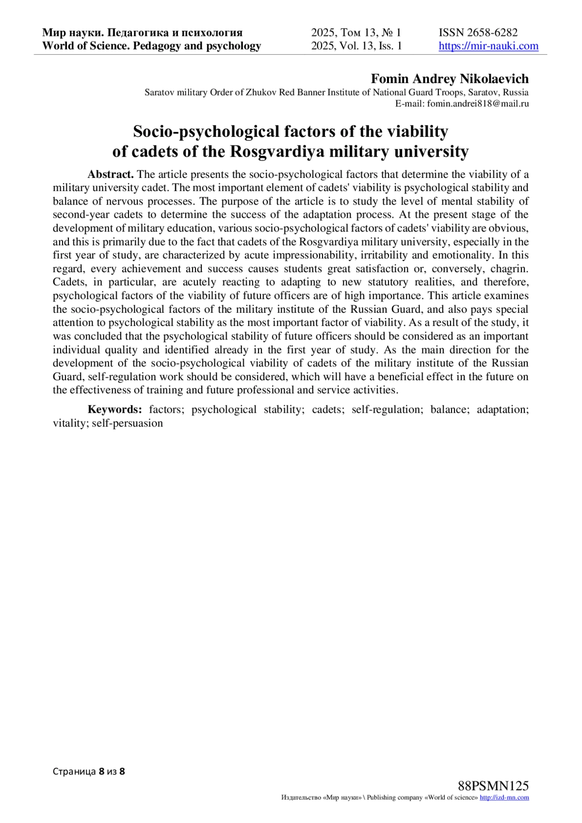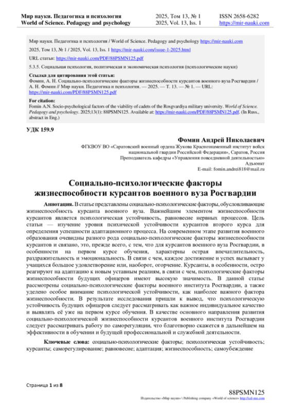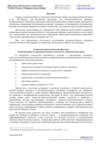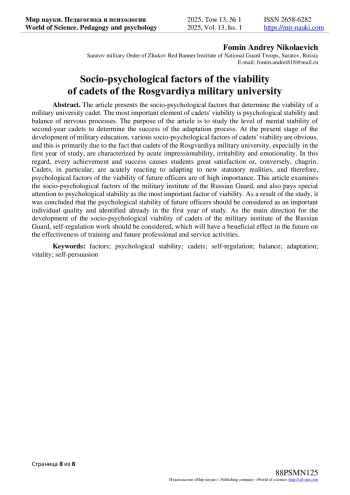 Цель статьи - изучение уровня психической устойчивости курсантов второго курса для определения успешности адаптационного процесса. На современном этапе развития военного образования очевидны разного рода социально-психологические факторы жизнеспособности курсантов и связано, это, прежде всего, с тем, что для курсантов военного вуза Росгвардии, в особенности на первом курсе обучения, характерны острая впечатлительность, раздражительность и эмоциональность. В связи с чем, каждое достижение и успех вызывает у учащихся большое удовлетворение или, наоборот, огорчение. Курсанты, в особенности, остро реагируют на адаптацию к новым уставным реалиям, в связи с чем, психологические факторы жизнеспособности будущих офицеров имеют высокую значимость. В данной статье рассмотрены социально-психологические факторы военного института Росгвардии, а также уделено особое внимание психологической устойчивости, как наиболее важного фактора жизнеспособности. В результате исследования пришли к вывод, что психологическую устойчивость будущих офицеров следует рассматривать как важное индивидуальное качество и выявлять её уже на первом курсе обучения. В качестве основного направления развития социально-психологической жизнеспособности курсантов военного института Росгвардии следует рассматривать работу по саморегуляции, что благотворно скажется в дальнейшем на эффективности в обучении и будущей профессиональной и служебной деятельности.