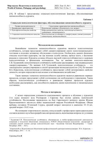 В статье представлены социально-психологические факторы, обусловливающие жизнеспособность курсанта военного вуза. Важнейшим элементом жизнеспособности курсантов является психологическая устойчивость, равновесие нервных процессов.