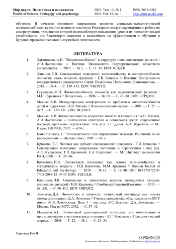 8. Боязитова, И.В. Личностный потенциал как основа жизнестойкости в студенческом возрасте / И.В. Боязитова, М.М. Эркенова // Russian Journal of Education and Psychology. - 2018. - № 12. - С. 19-40. DOI: 10.12731/2218-7405-2018-12-19-40 EDN: YZLULB