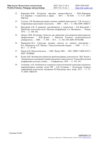 16. Иванников, В.А. Структура волевых качеств по данным самооценки / В.А. Иванников, Е.В. Эйдман // Психологический журнал. - 1990. - Т. 11. - № 3. - С. 39-49.