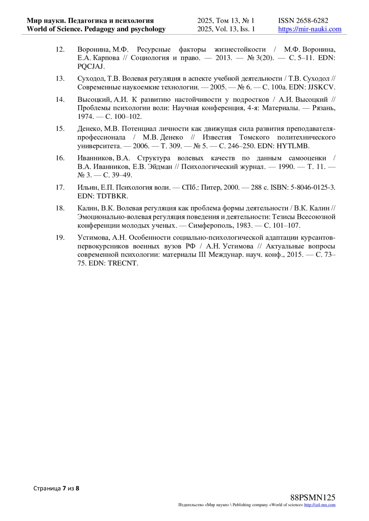 12. Воронина, М.Ф. Ресурсные факторы жизнестойкости / М.Ф. Воронина, Е.А. Карпова // Социология и право. - 2013. - № 3(20). - С. 5-11. EDN: PQCJAJ