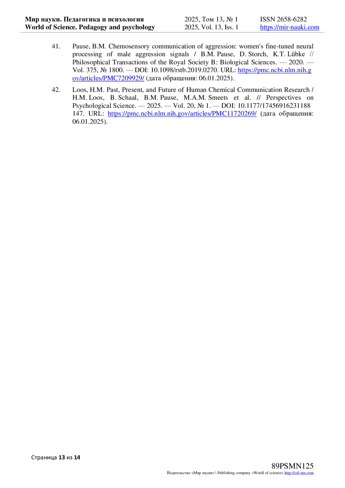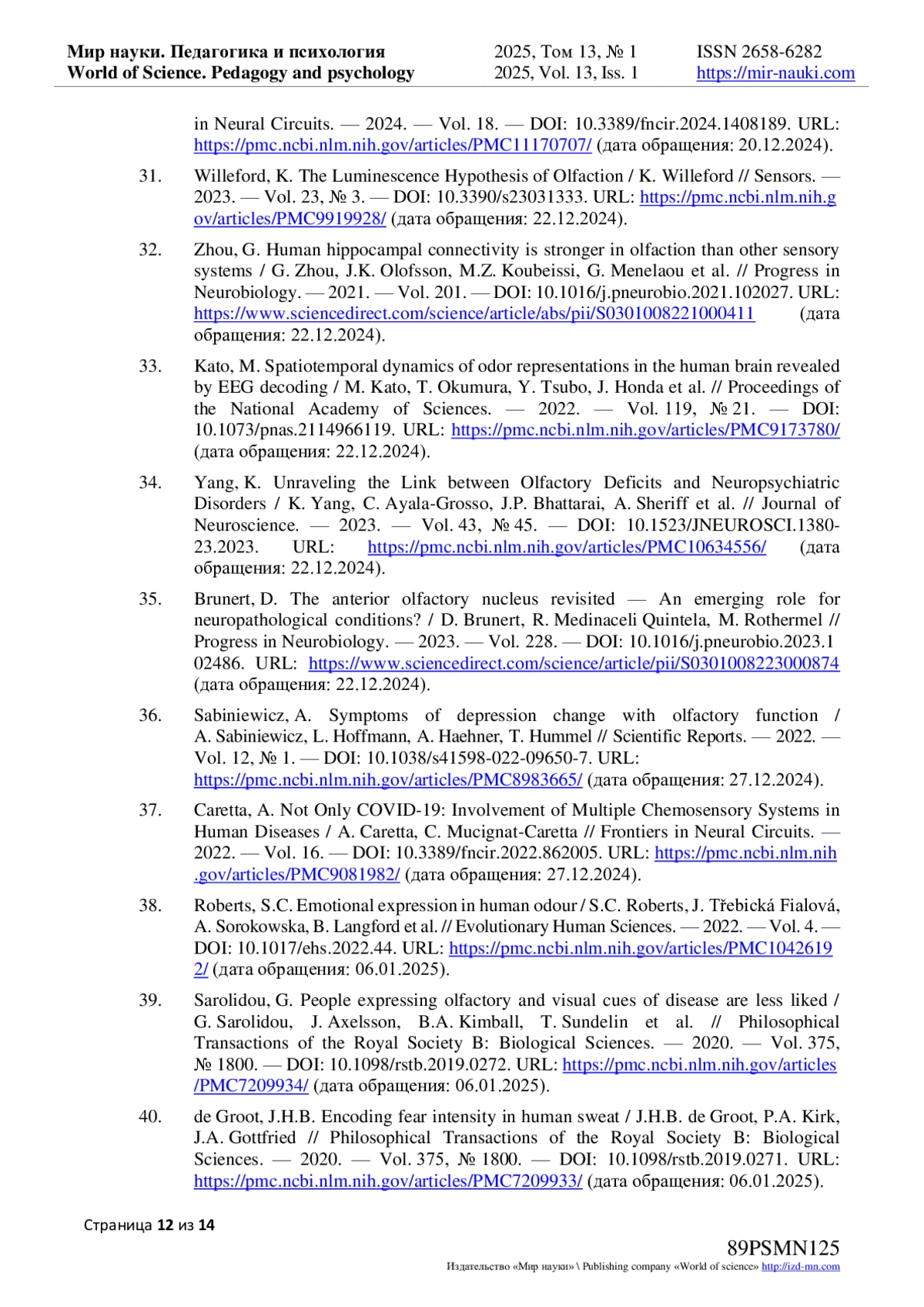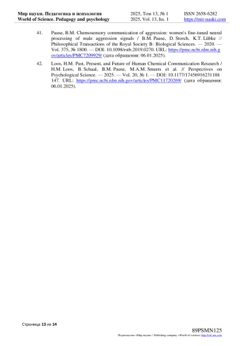 42. Loos, H.M. Past, Present, and Future of Human Chemical Communication Research / H.M. Loos, B. Schaal, B.M. Pause, M.A.M. Smeets et al. // Perspectives on Psychological Science. - 2025. - Vol. 20, № 1. - URL: https://pmc.ncbi.nlm.nih.gov/articles/PMC11720269/(дата обращения: 06.01.2025). DOI: 10.1177/17456916231188147 EDN: UJDGGL