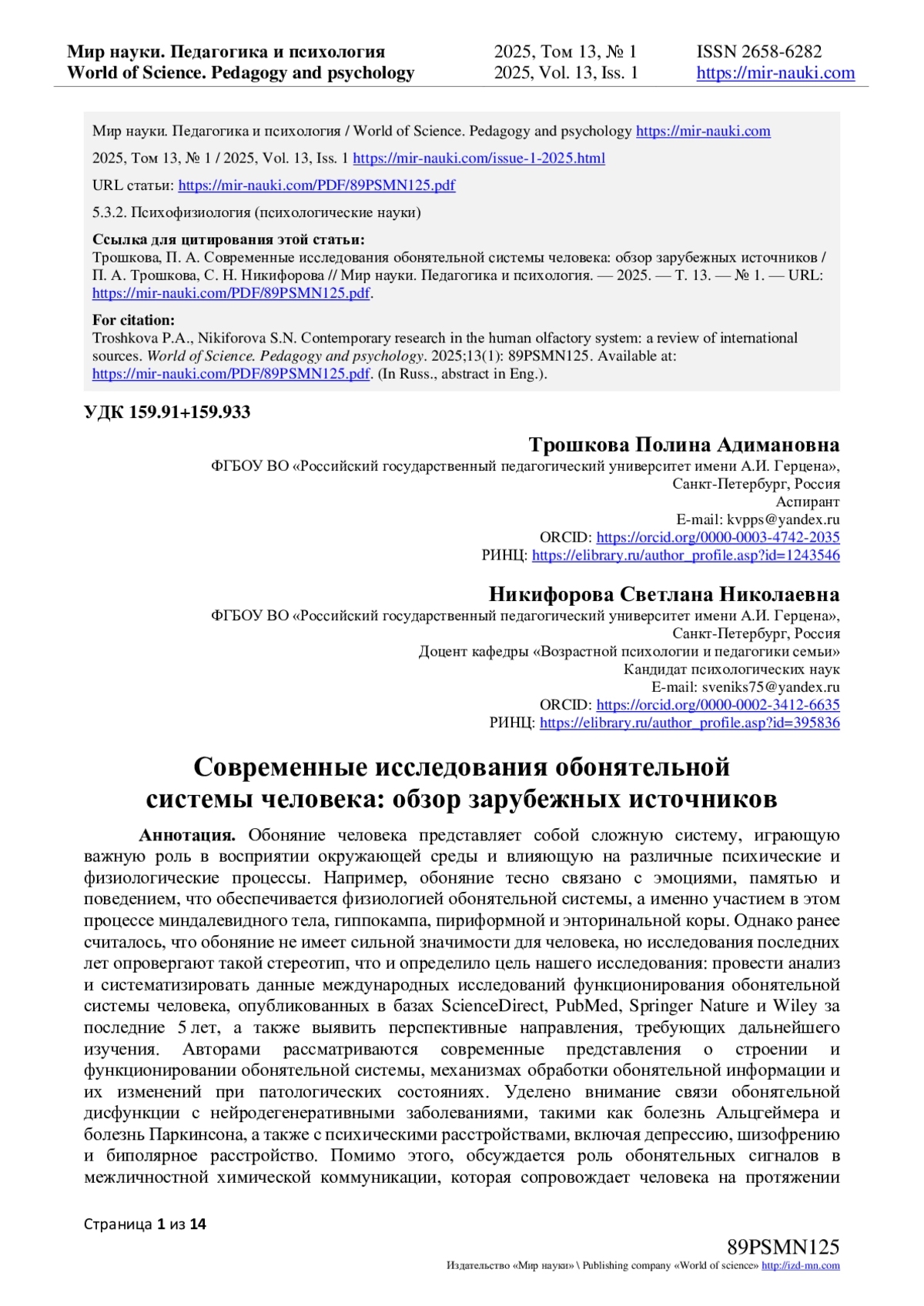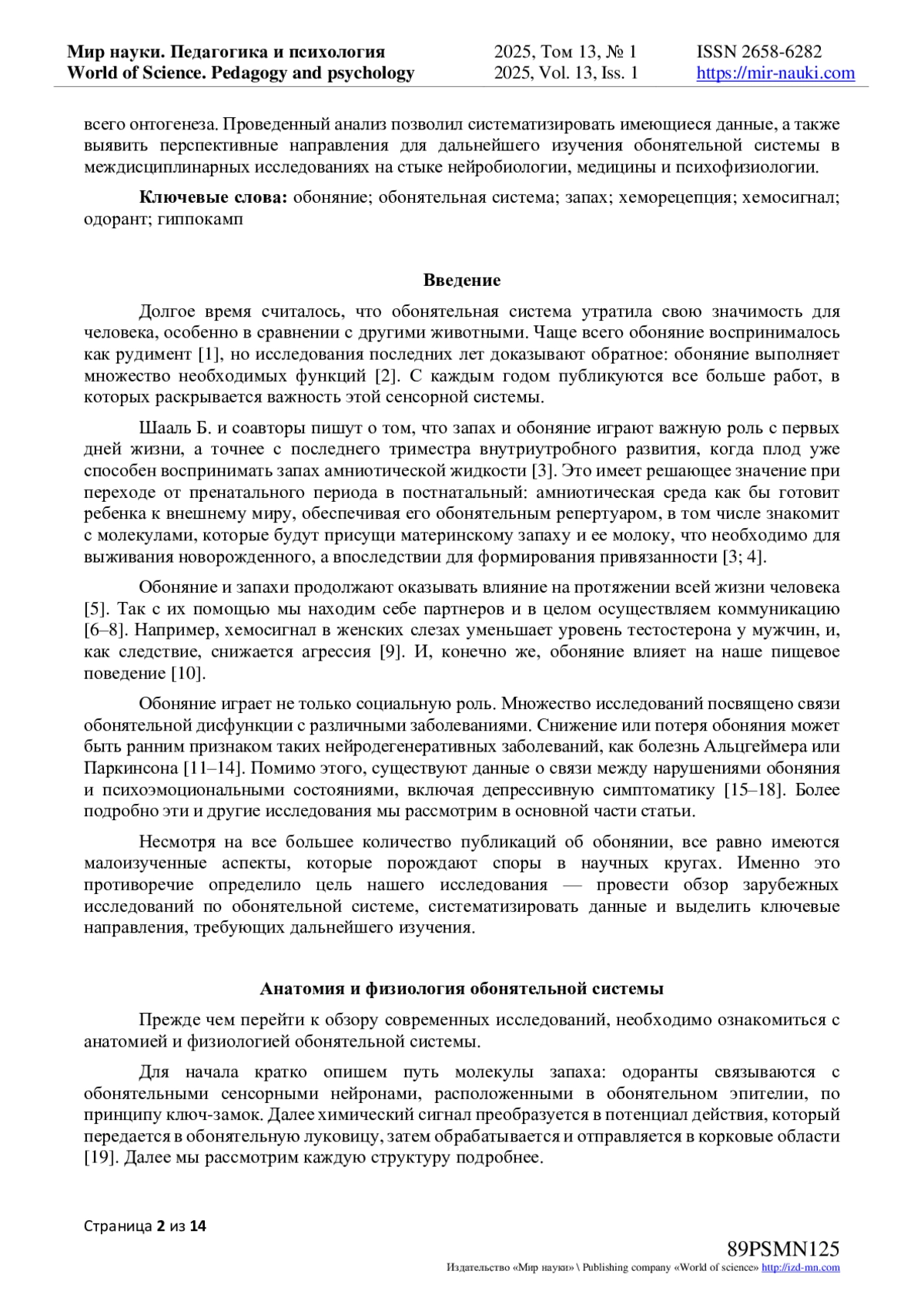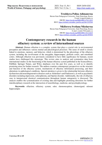 Обоняние человека представляет собой сложную систему, играющую важную роль в восприятии окружающей среды и влияющую на различные психические и физиологические процессы. Например, обоняние тесно связано с эмоциями, памятью и поведением, что обеспечивается физиологией обонятельной системы, а именно участием в этом процессе миндалевидного тела, гиппокампа, пириформной и энторинальной коры. Однако ранее считалось, что обоняние не имеет сильной значимости для человека, но исследования последних лет опровергают такой стереотип, что и определило цель нашего исследования: провести анализ и систематизировать данные международных исследований функционирования обонятельной системы человека, опубликованных в базах ScienceDirect, PubMed, Springer Nature и Wiley за последние 5 лет, а также выявить перспективные направления, требующих дальнейшего изучения. Авторами рассматриваются современные представления о строении и функционировании обонятельной системы, механизмах обработки обонятельной информации и их изменений при патологических состояниях. Уделено внимание связи обонятельной дисфункции с нейродегенеративными заболеваниями, такими как болезнь Альцгеймера и болезнь Паркинсона, а также с психическими расстройствами, включая депрессию, шизофрению и биполярное расстройство. Помимо этого, обсуждается роль обонятельных сигналов в межличностной химической коммуникации, которая сопровождает человека на протяжении всего онтогенеза. Проведенный анализ позволил систематизировать имеющиеся данные, а также выявить перспективные направления для дальнейшего изучения обонятельной системы в междисциплинарных исследованиях на стыке нейробиологии, медицины и психофизиологии.