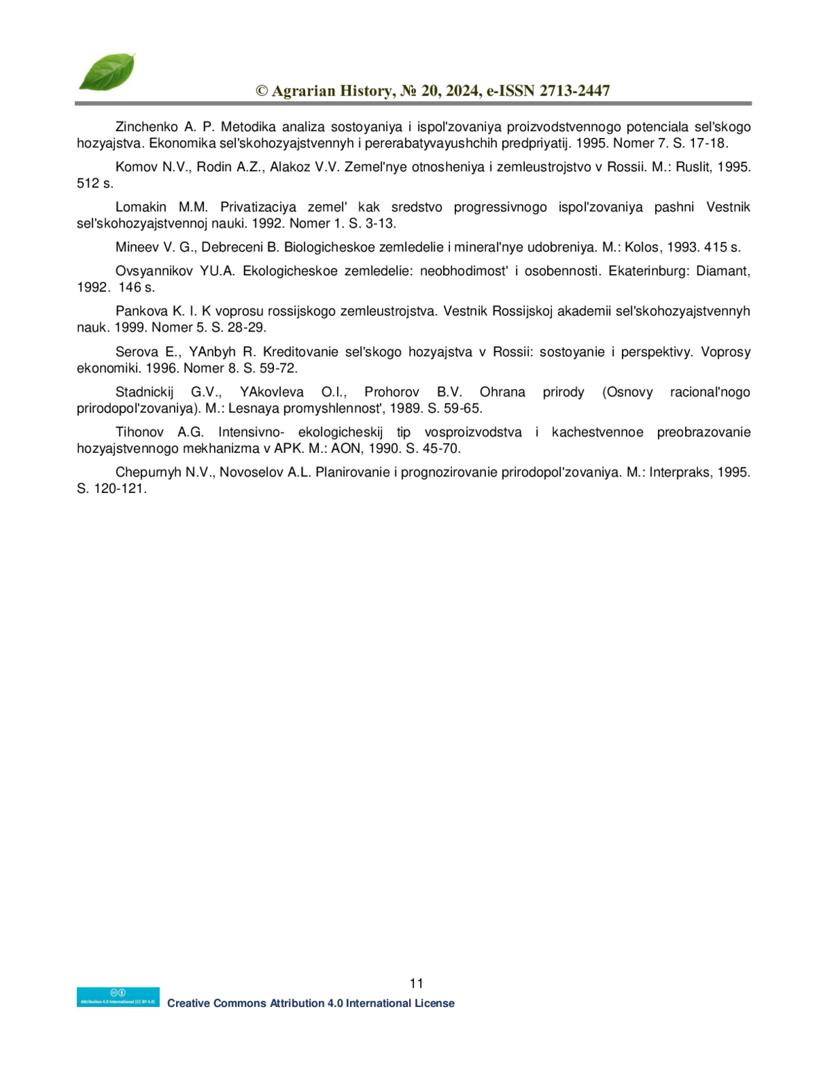 13. Панкова К. И. К вопросу российского землеустройства. Вестник Российской академии сельскохозяйственных наук. 1999. Номер 5. С. 28-29.