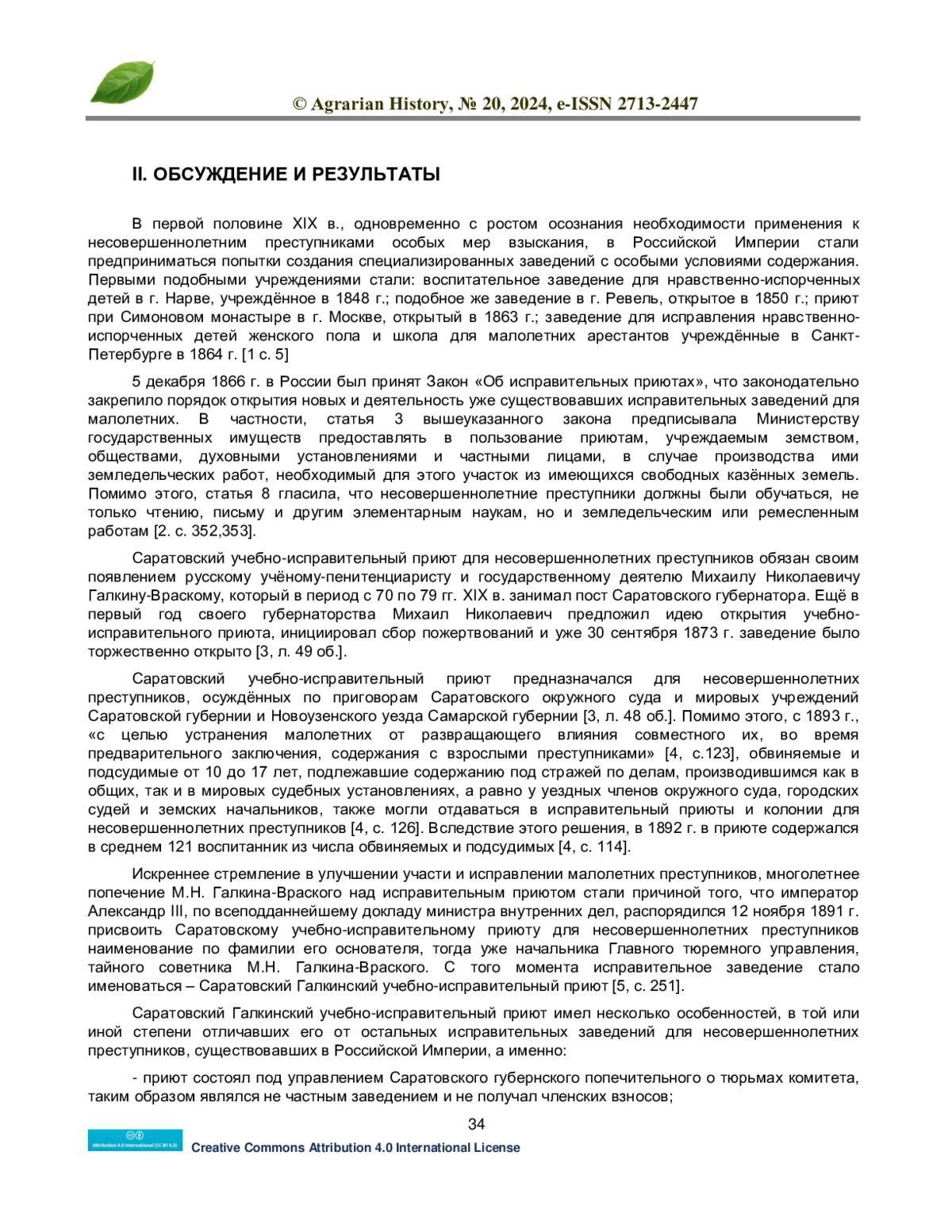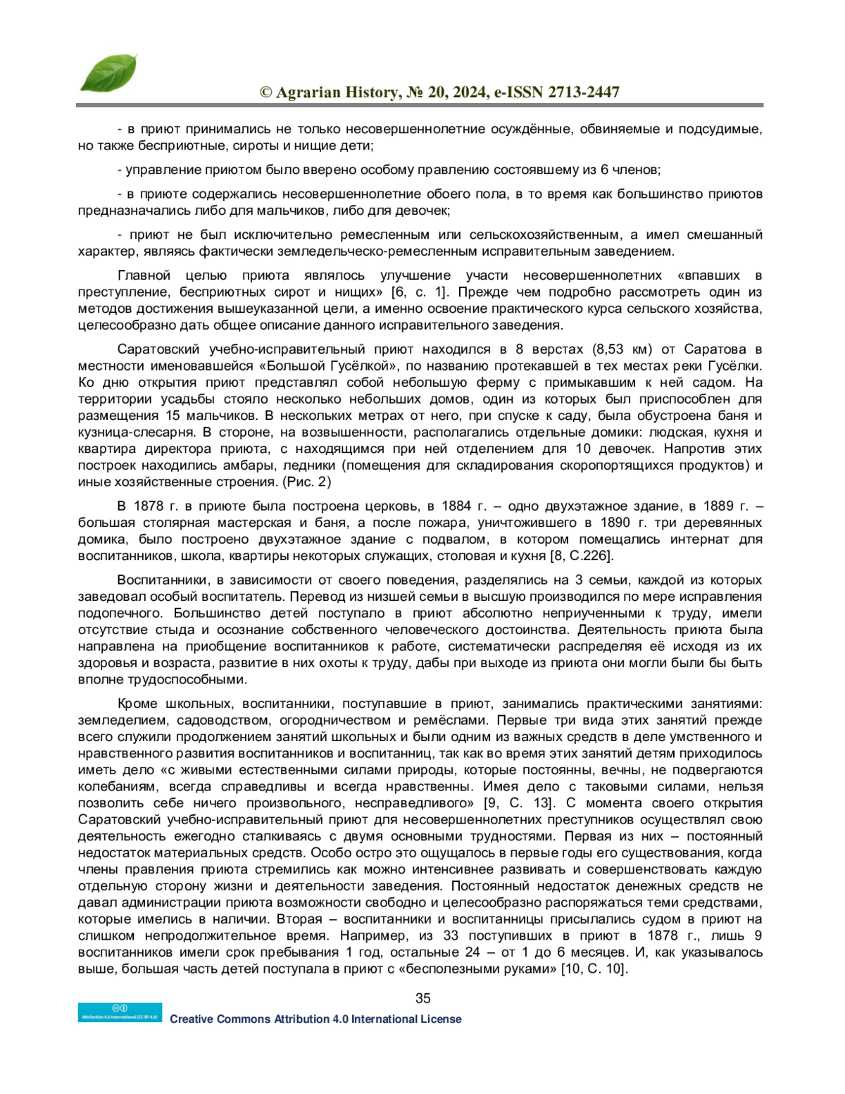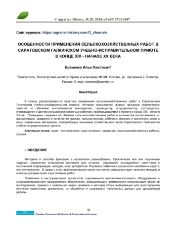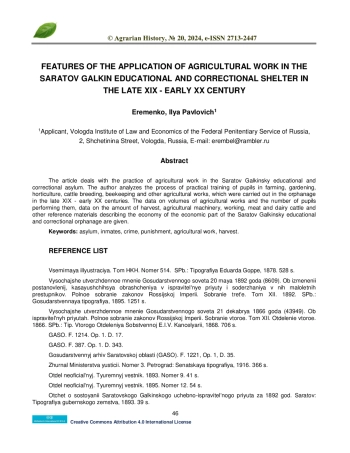 В статье рассматривается практика применения сельскохозяйственных работ в Саратовском Галкинском учебно-исправительном приюте. Автором представлен анализ процесса практических занятий по обучению воспитанников земледелию, садоводству, огородничеству, скотоводству, пчеловодству и другим сельскохозяйственным работам, производившимся в приюте в конце XIX - начале ХХ вв. Приведены сведения об объёмах сельскохозяйственных работ и количестве воспитанников их выполнявших, сведения о количестве урожая, сельхозтехники, рабочего, мясного и молочного скота и иные справочные материалы, описывающие экономику хозяйственной части Саратовского Галкинского учебно-исправительного приюта.