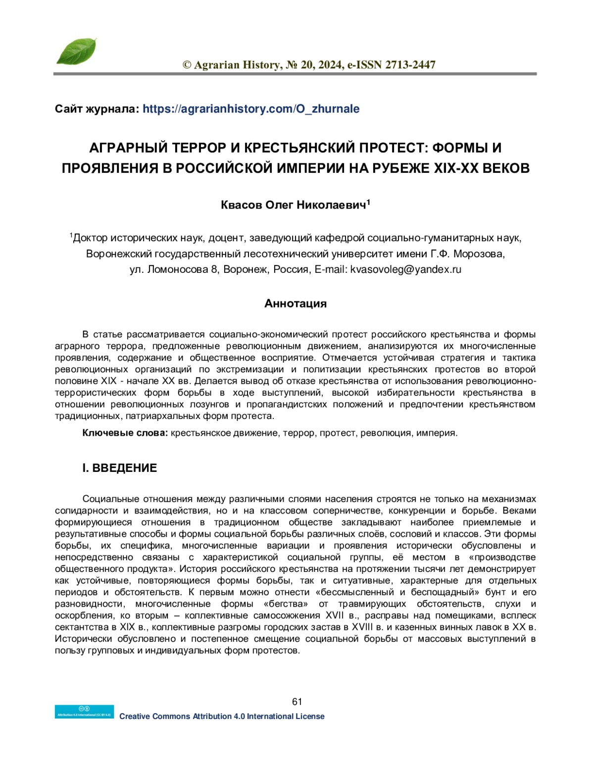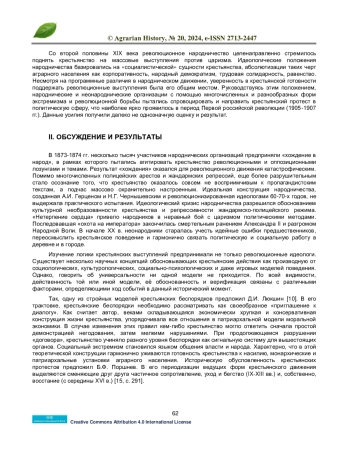 В статье рассматривается социально-экономический протест российского крестьянства и формы аграрного террора, предложенные революционным движением, анализируются их многочисленные проявления, содержание и общественное восприятие. Отмечается устойчивая стратегия и тактика революционных организаций по экстремизации и политизации крестьянских протестов во второй половине XIX - начале XX вв. Делается вывод об отказе крестьянства от использования революционно-террористических форм борьбы в ходе выступлений, высокой избирательности крестьянства в отношении революционных лозунгов и пропагандистских положений и предпочтении крестьянством традиционных, патриархальных форм протеста.