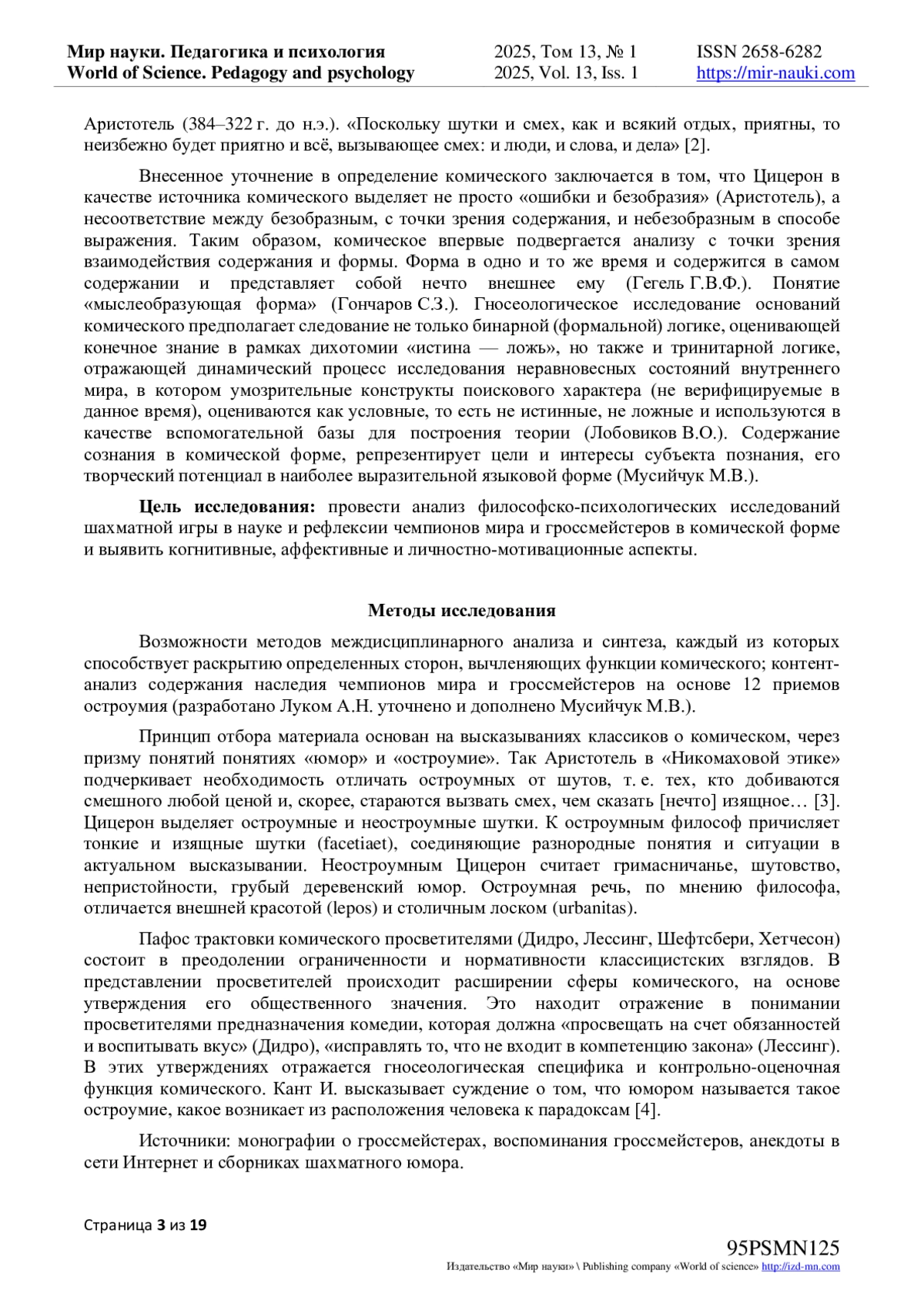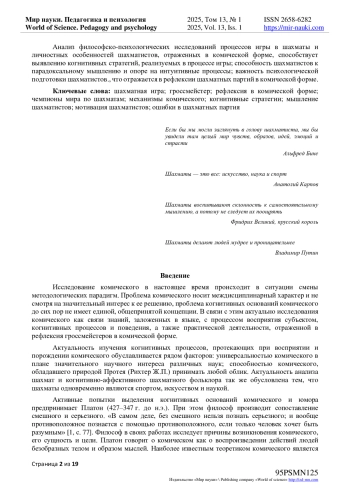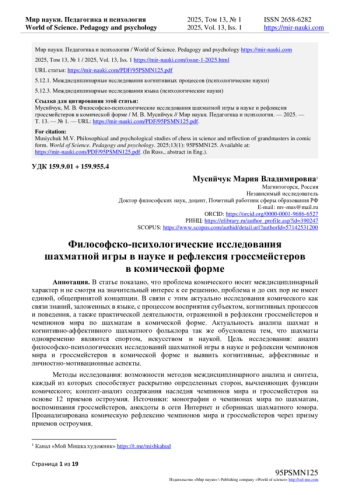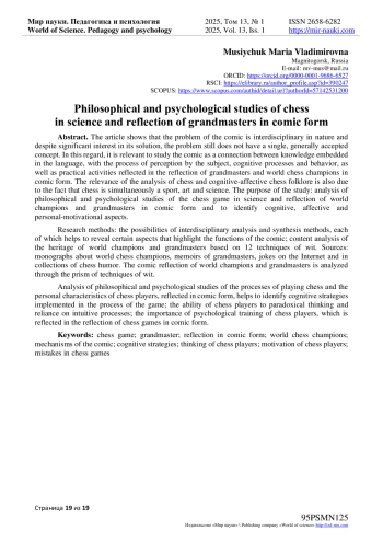 Цель исследования: анализ философско-психологических исследований шахматной игры в науке и рефлексии чемпионов мира и гроссмейстеров в комической форме и выявить когнитивные, аффективные и личностно-мотивационные аспекты.