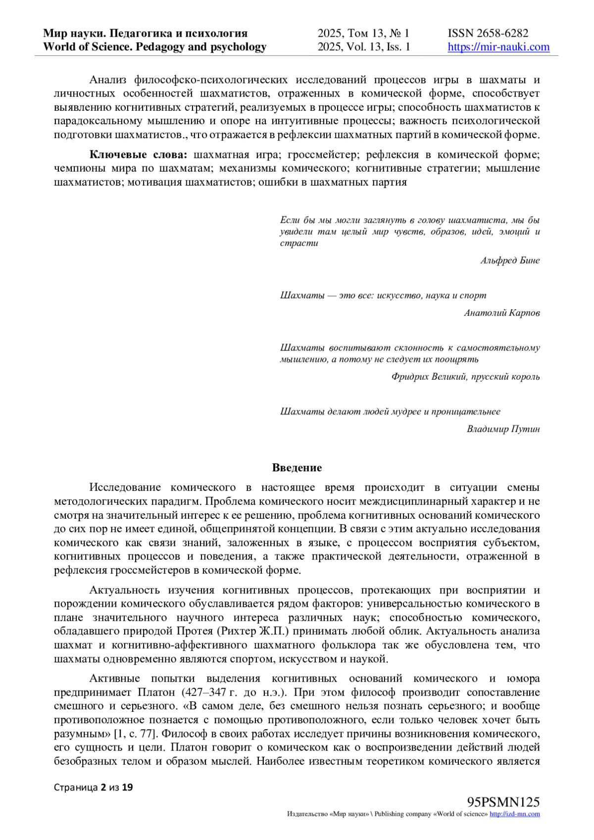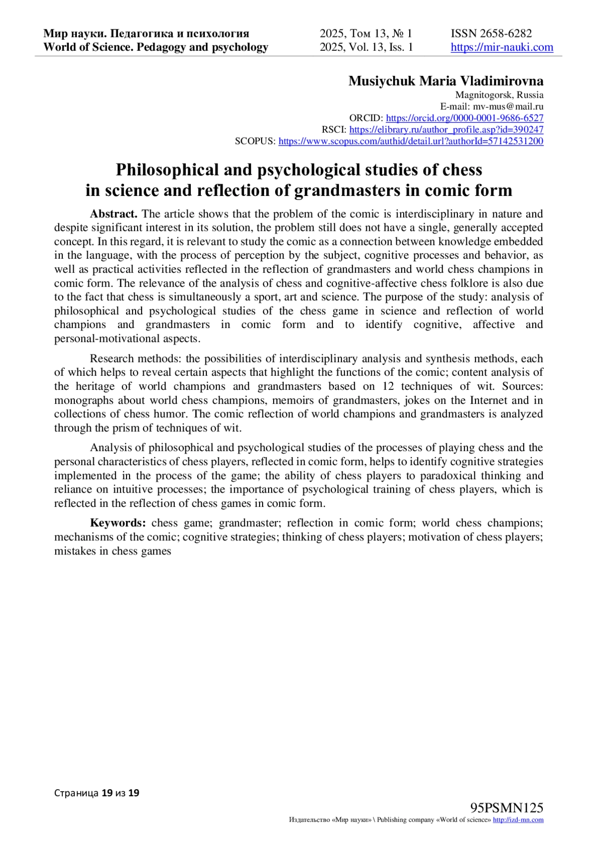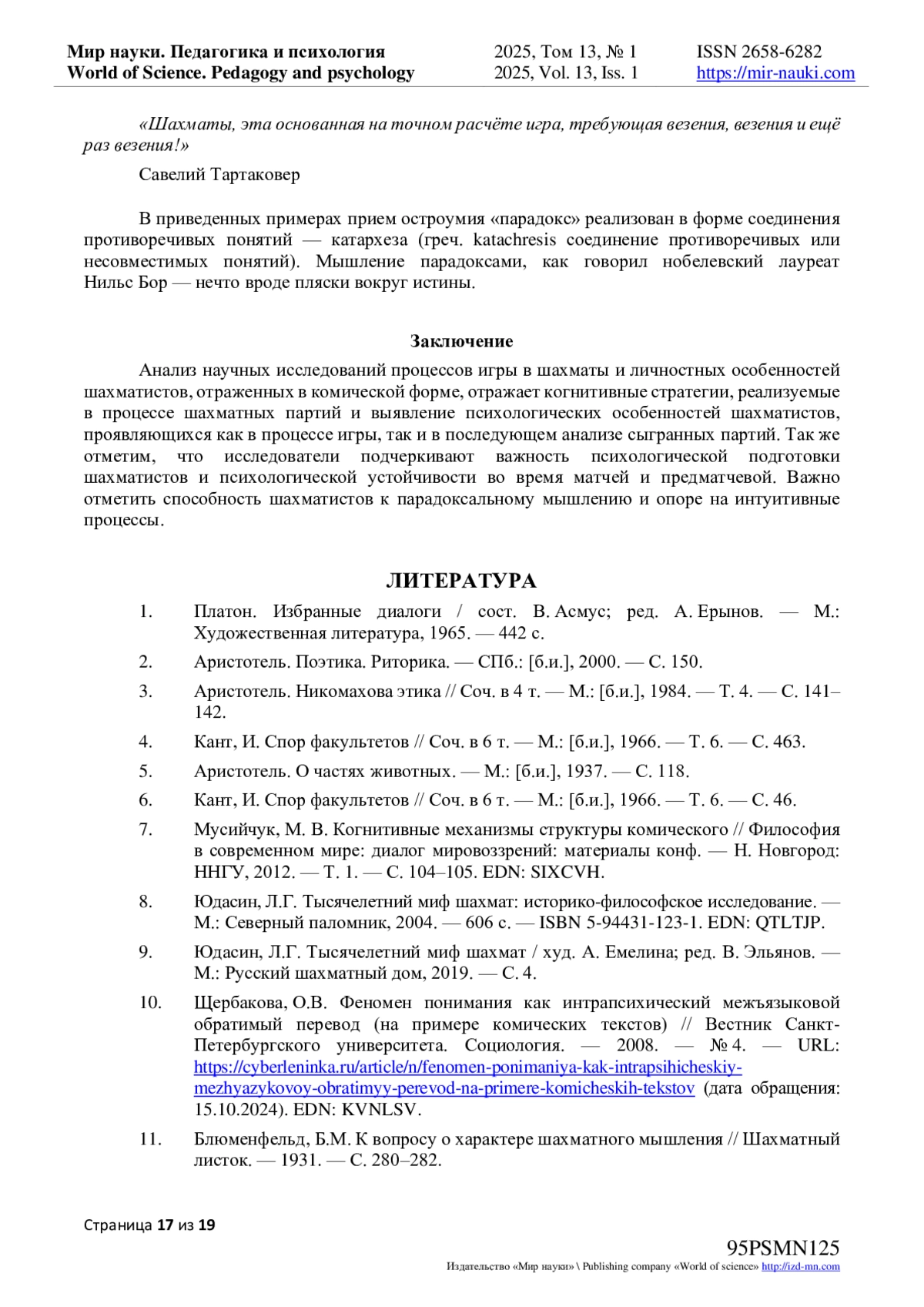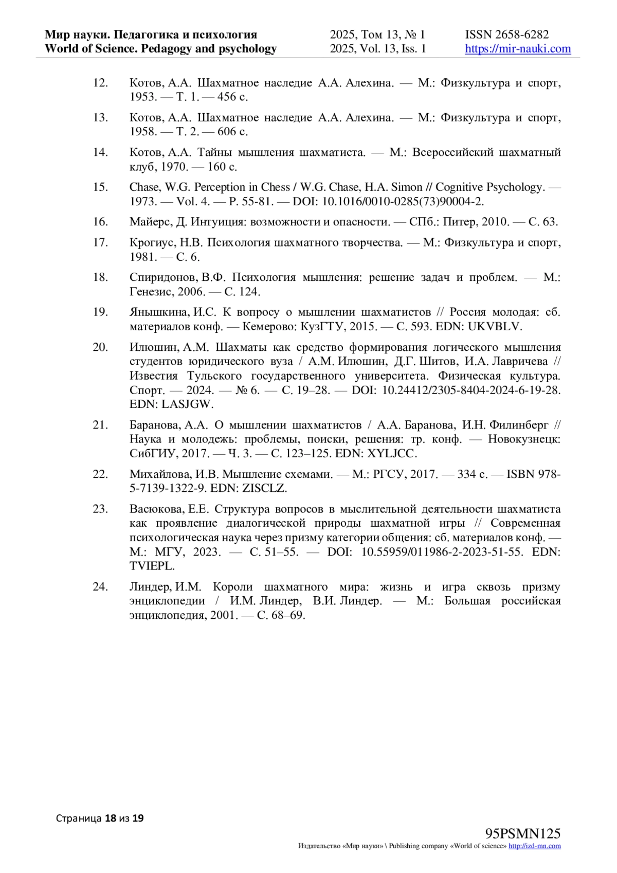 19. Янышкина, И.С. К вопросу о мышлении шахматистов // Россия молодая: сб. материалов конф. - Кемерово: КузГТУ, 2015. - С. 593. EDN: UKVBLV