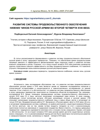 Актуальность темы исследования обусловлена тем, что развитие системы продовольственного обеспечения русской армии в XVIII веке является одним из наименее исследованных вопросов в отечественной историографии и концентрируется в немногочисленных исследованиях по данной тематике. Стоит отметить и то обстоятельство, что развитие системы продовольственного обеспечения в эпоху «дворцовых переворотов» практически не становилось объектом исследований. Так, например, исследование В. Н. Бенда, посвящено формированию системы продовольственного обеспечения в начале XVIII века [1] и лишь частично затрагивает исследуемый нами вопрос. В свою очередь, обобщающая статья коллектива авторов «История организации питания в русской армии» [15] описывает организацию продовольственного снабжения лишь в самых общих чертах и затрагивает не только XVIII век. Фундаментальная работа Л. Г. Бескровного «Русская армия и флот в XVIII веке» [2] хоть и затрагивает формирование системы снабжения, но крайне расплывчато, акцентируя внимание больше на тяготах крестьян, чем на том, какими путями продукты попадали на стол к военнослужащим, практически полностью зависимым от содержания государства. Важно отметить, что период «дворцовых переворотов» традиционно оценивается негативно или, в лучшем случае, инерционно. Однако, учитывая то обстоятельство, что во второй половине XVIII века русская армия достигла существенных успехов, можно утверждать, что и в рассматриваемый период для нее было характерно поступательное развитие и совершенствование основ, заложенных в первой четверти XVIII века.