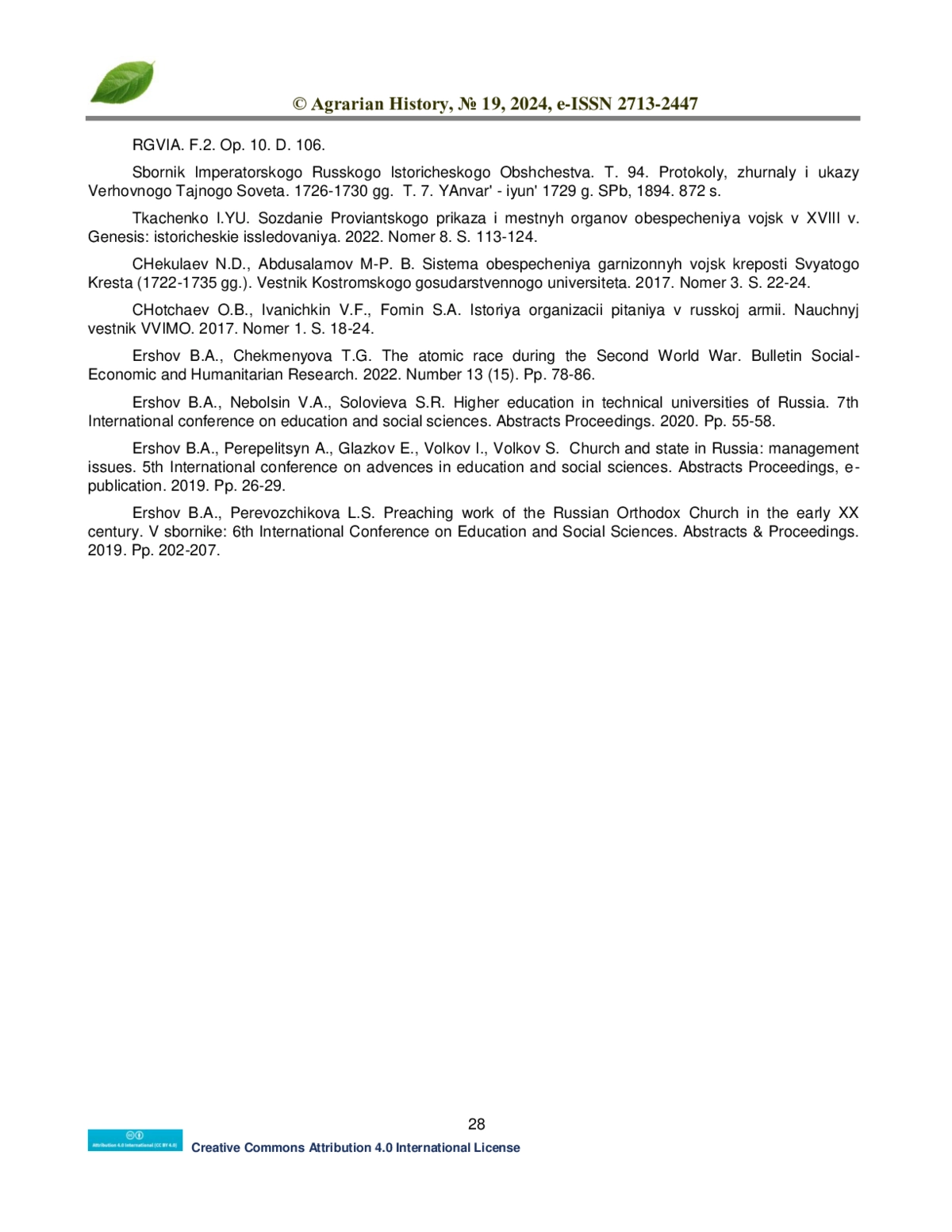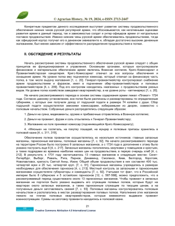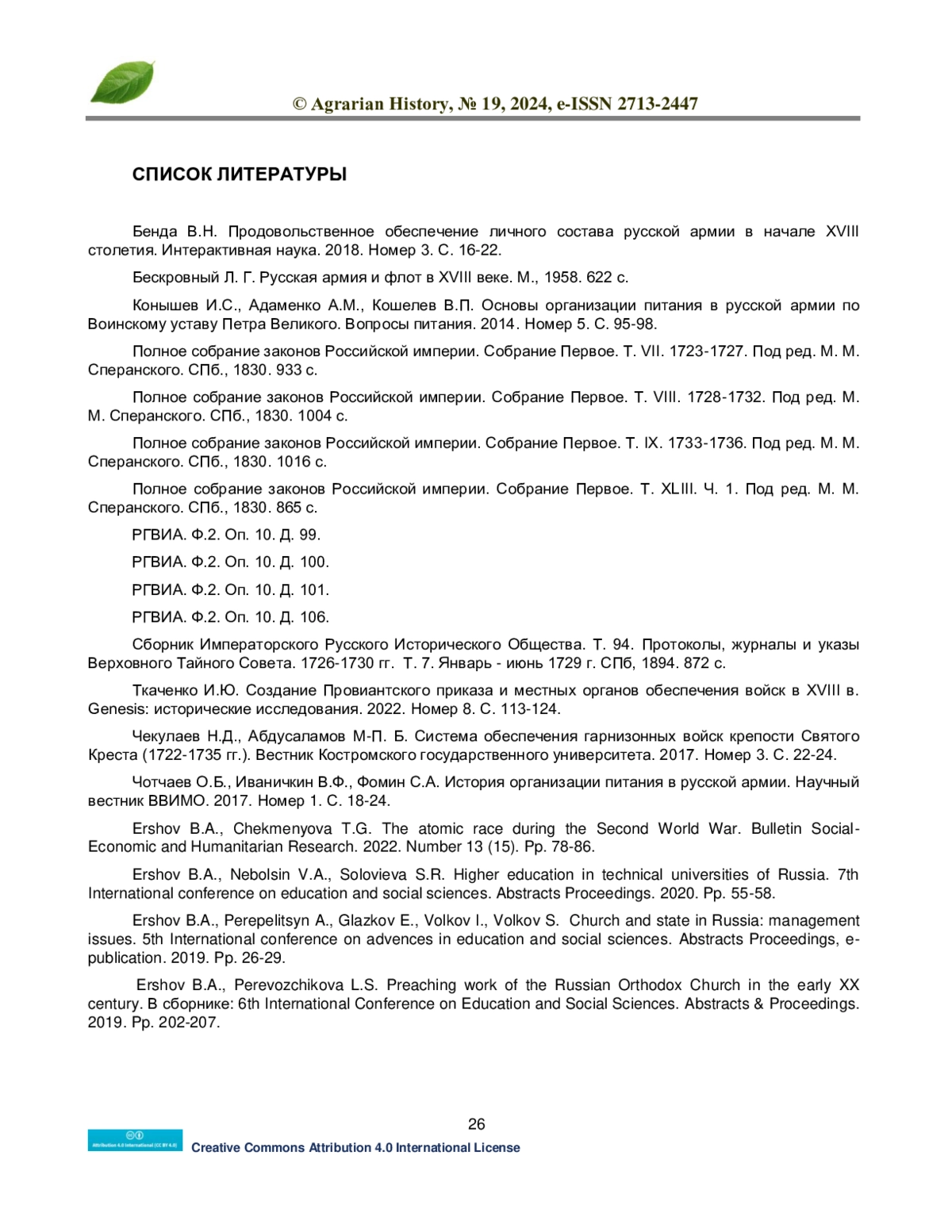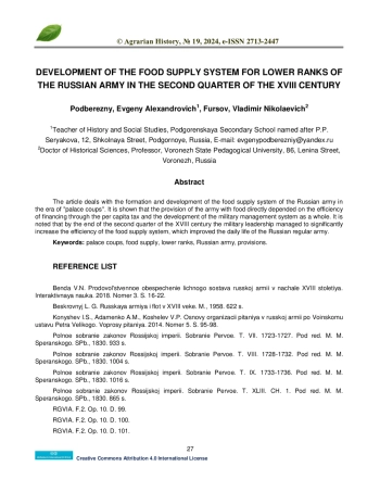1. Бенда В.Н. Продовольственное обеспечение личного состава русской армии в начале XVIII столетия. Интерактивная наука. 2018. Номер 3. С. 16-22.