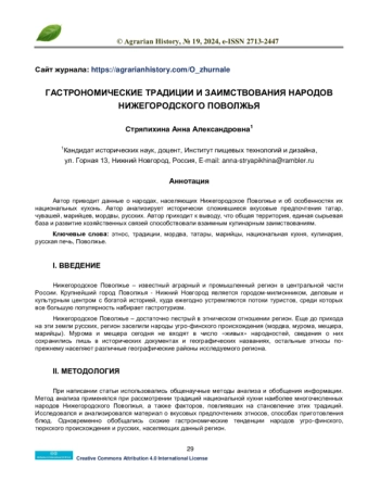 СТРЯПИХИНА А. А. ГАСТРОНОМИЧЕСКИЕ ТРАДИЦИИ И ЗАИМСТВОВАНИЯ НАРОДОВ НИЖЕГОРОДСКОГО ПОВОЛЖЬЯ // АГРАРНАЯ ИСТОРИЯ. 2024. № 19