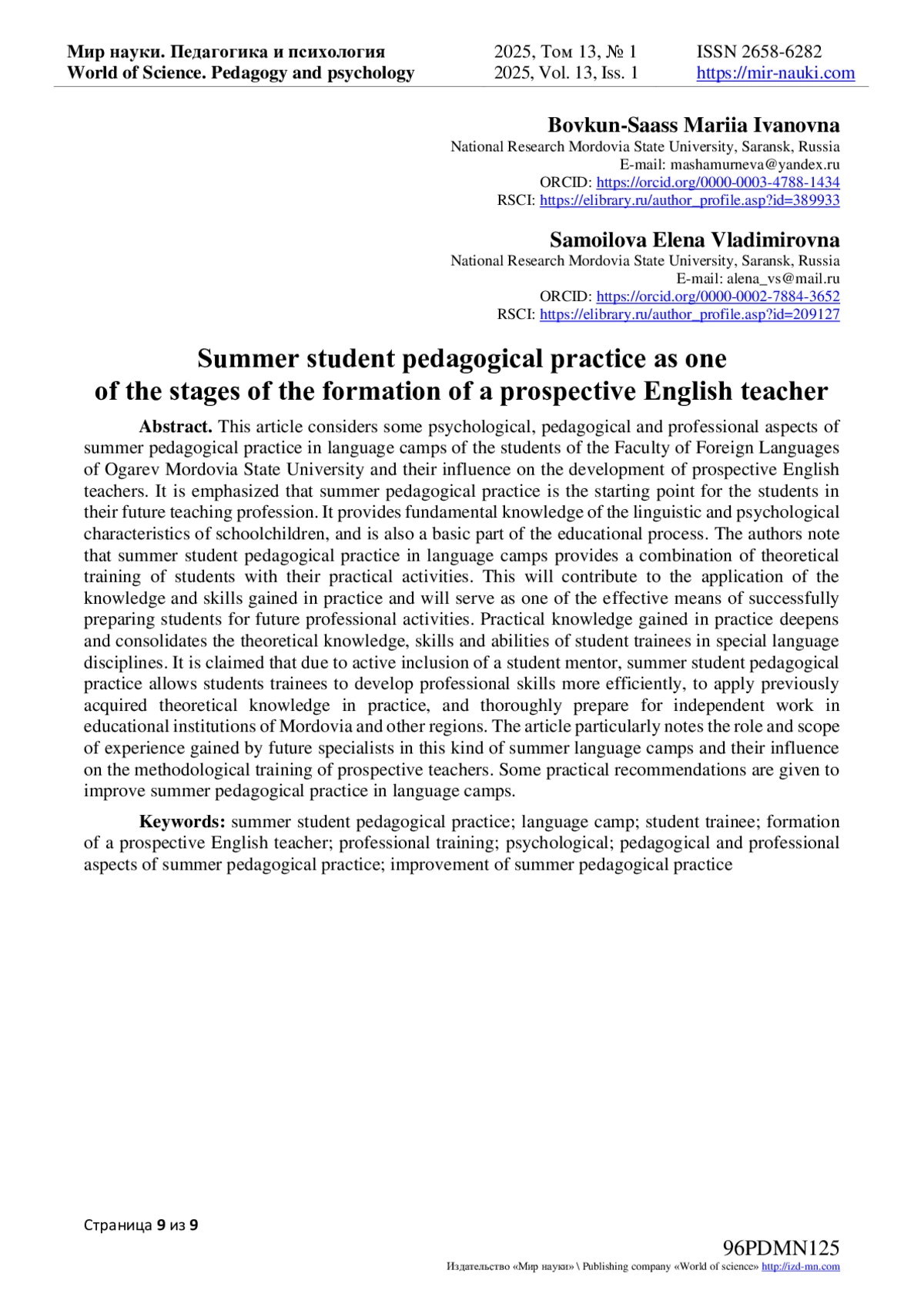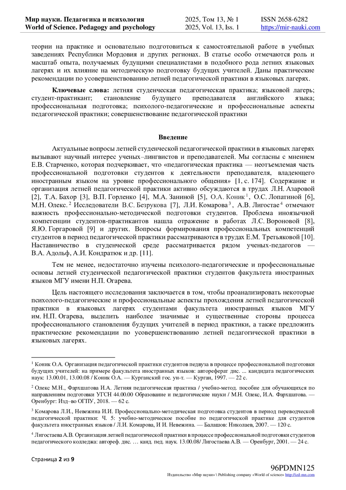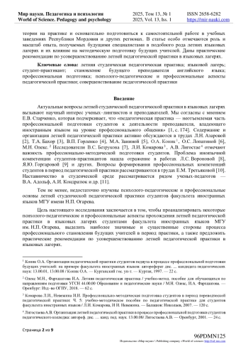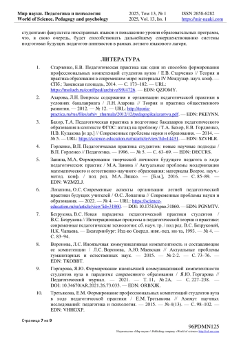6. Лопатина, О. С. Современные аспекты организации летней педагогической практики будущих учителей / О. С. Лопатина // Современные проблемы науки и образования. - 2022. - № 4. - URL: https://science-education.ru/ru/article/view?id=31860. - -. DOI: 10.17513/spno.31860 EDN: PGNMTV