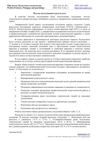 Методология, методы и методики. На теоретическом этапе исследования был проведен проблемный анализ психолого-педагогической литературы. В ходе эмпирического исследования были использованы такие методы, как опрос студентов и анализ продуктов деятельности (выполненных творческих заданий, курсовых работ). При разработке программы практики был осуществлен анализ цифровых ресурсов, которые доступны студентам.