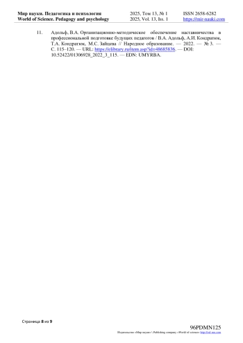 11. Адольф, В. А. Организационно-методическое обеспечение наставничества в профессиональной подготовке будущих педагогов / В. А. Адольф, А. И. Кондратюк, Т. А. Кондратюк, М. С. Зайцева // Народное образование. - 2022. - № 3. - С. 115-120. - URL: item.asp?id=48685836. - -. DOI: 10.52422/01306928_2022_3_115 EDN: UMYRBA