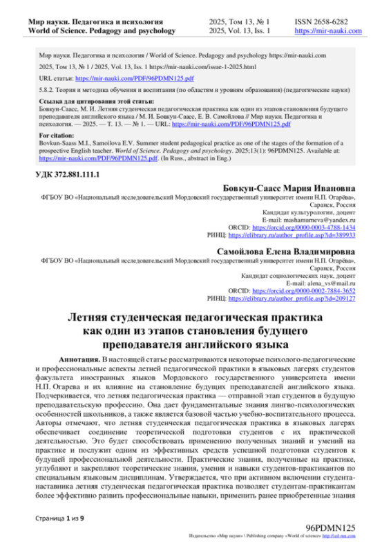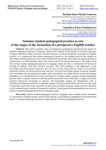 В настоящей статье рассматриваются некоторые психолого-педагогические и профессиональные аспекты летней педагогической практики в языковых лагерях студентов факультета иностранных языков Мордовского государственного университета имени Н. П. Огарева и их влияние на становление будущих преподавателей английского языка. Подчеркивается, что летняя педагогическая практика - отправной этап студентов в будущую преподавательскую профессию. Она дает фундаментальные знания лингво-психологических особенностей школьников, а также является базовой частью учебно-воспитательного процесса. Авторы отмечают, что летняя студенческая педагогическая практика в языковых лагерях обеспечивает соединение теоретической подготовки студентов с их практической деятельностью. Это будет способствовать применению полученных знаний и умений на практике и послужит одним из эффективных средств успешной подготовки студентов к будущей профессиональной деятельности. Практические знания, полученные на практике, углубляют и закрепляют теоретические знания, умения и навыки студентов-практикантов по специальным языковым дисциплинам. Утверждается, что при активном включении студента-наставника летняя студенческая педагогическая практика позволяет студентам-практикантам более эффективно развить профессиональные навыки, применить ранее приобретенные знания теории на практике и основательно подготовиться к самостоятельной работе в учебных заведениях Республики Мордовия и других регионах. В статье особо отмечаются роль и масштаб опыта, получаемых будущими специалистами в подобного рода летних языковых лагерях и их влияние на методическую подготовку будущих учителей. Даны практические рекомендации по усовершенствованию летней педагогической практики в языковых лагерях.