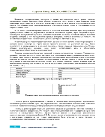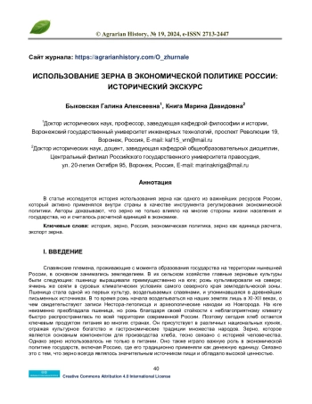 В статье исследуется история использования зерна как одного из важнейших ресурсов России, который активно применялся внутри страны в качестве инструмента регулирования экономической политики. Авторы доказывают, что зерно не только влияло на многие стороны жизни населения и государства, но и считалось расчетной единицей в экономике.