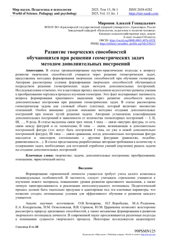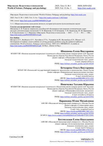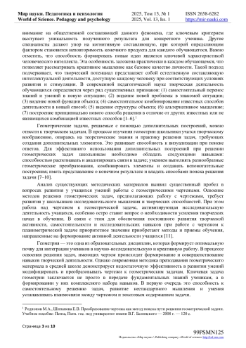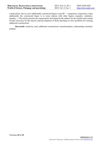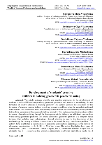 В статье проанализированы научно-практические подходы к вопросу развития творческих способностей учащихся через решение геометрических задач, представлена методика формирования творческих способностей при обучении геометрии. Авторами рассмотрены условия формирования творческих способностей обучающихся посредством решения геометрических задач методом дополнительных построений. Исследователями отмечено, что в настоящее время у школьников недостаточно развиты умения к преобразованию чертежа в процессе изучения геометрии. Этот факт подчеркивает значимость вопроса формирования креативного мышления через развитие способности видеть дополнительные построения при решении геометрических задач. В статье рассмотрена геометрическая задача как сложный объект (система), который включает множество отношений. Особое внимание уделено описанию методике создания дополнительных построений при поиске путей решения задачи. Авторами установлена классификация дополнительных построений в зависимости от количества элементарных построений - I, II, III, …, N рода. В статье выделены связи трех типов: I типа - связи «внутри» фигуры, то есть связи между фигурой и ее элементами; II типа - связи, возникающие в дополнительно построенной фигуре (это могут быть построения I типа, но уже в новой дополнительно построенной фигуре); III типа - связи сравнения, когда дополнительно построенная фигура находится в некотором соотношении с другими фигурами (равенство, подобие, равновеликость…). В статье представлены разработанные авторами требования к количеству и содержанию задач, необходимых для поэтапной отработки умений (научения) решать задачи на создание дополнительных построений.