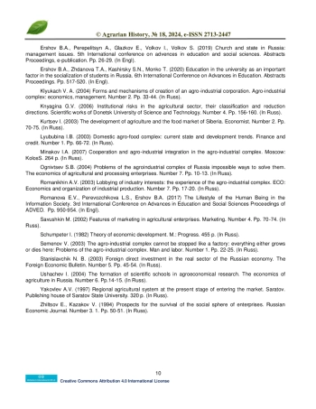 8. Klyukach V. A. (2004) Forms and mechanisms of creation of an agro-industrial corporation. Agro-industrial complex: economics, management. Number 2. Pp. 33-44. (In Russ).