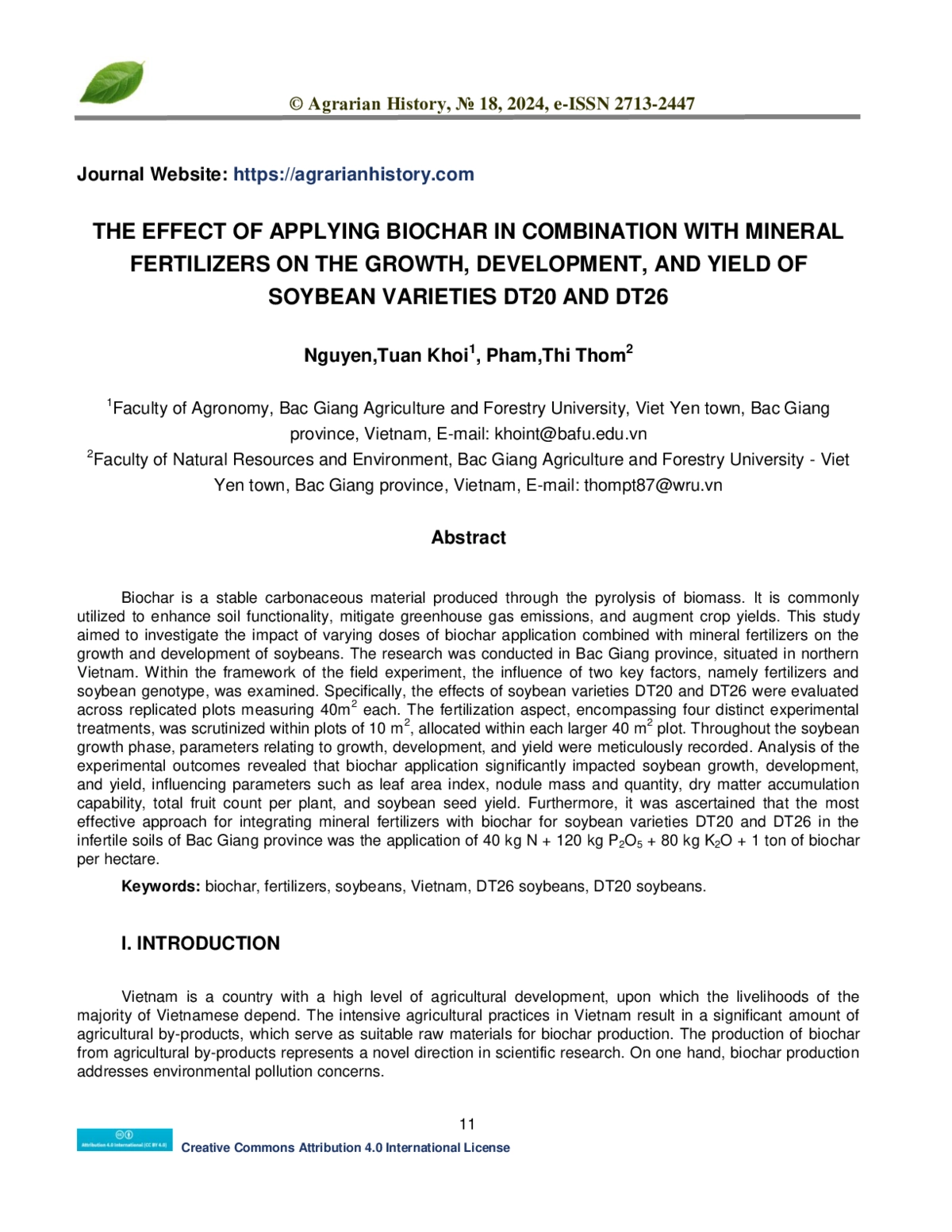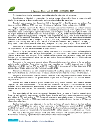 Biochar is a stable carbonaceous material produced through the pyrolysis of biomass. It is commonly utilized to enhance soil functionality, mitigate greenhouse gas emissions, and augment crop yields. This study aimed to investigate the impact of varying doses of biochar application combined with mineral fertilizers on the growth and development of soybeans. The research was conducted in Bac Giang province, situated in northern Vietnam. Within the framework of the field experiment, the influence of two key factors, namely fertilizers and soybean genotype, was examined. Specifically, the effects of soybean varieties DT20 and DT26 were evaluated across replicated plots measuring 40m2 each. The fertilization aspect, encompassing four distinct experimental treatments, was scrutinized within plots of 10 m2, allocated within each larger 40 m2 plot. Throughout the soybean growth phase, parameters relating to growth, development, and yield were meticulously recorded. Analysis of the experimental outcomes revealed that biochar application significantly impacted soybean growth, development, and yield, influencing parameters such as leaf area index, nodule mass and quantity, dry matter accumulation capability, total fruit count per plant, and soybean seed yield. Furthermore, it was ascertained that the most effective approach for integrating mineral fertilizers with biochar for soybean varieties DT20 and DT26 in the infertile soils of Bac Giang province was the application of 40 kg N + 120 kg P2O5 + 80 kg K2O + 1 ton of biochar per hectare.