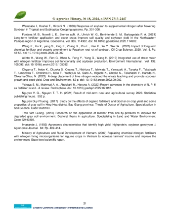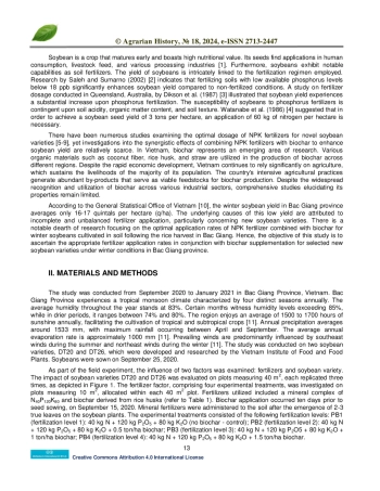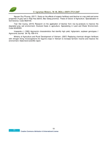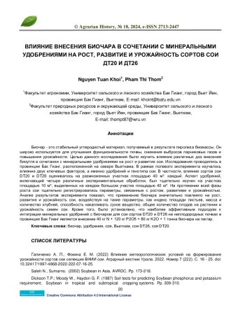 Биочар - это стабильный углеродистый материал, получаемый в результате пиролиза биомассы. Он широко используется для улучшения функциональности почвы, снижения выбросов парниковых газов и повышения урожайности. Целью данного исследования было изучить влияние различных доз внесения биоугля в сочетании с минеральными удобрениями на рост и развитие сои. Исследования проводились в провинции Бак Гианг, расположенной на севере Вьетнама. В рамках полевого эксперимента изучалось влияние двух ключевых факторов, а именно удобрений и генотипа сои. В частности, влияние сортов сои DT20 и DT26 оценивалось на размноженных участках площадью 40 м². каждый. Аспект удобрений, включающий четыре различные экспериментальные обработки, был тщательно изучен на участках площадью 10 м², выделенных на каждом большом участке площадью 40 м². На протяжении всей фазы роста сои тщательно регистрировались параметры, связанные с ростом, развитием и урожайностью. Анализ результатов эксперимента показал, что применение биочара значительно повлияло на рост, развитие и урожайность сои, воздействуя на такие параметры, как индекс площади листьев, масса и количество клубней, способность накапливать сухое вещество, общее количество плодов на растении и урожайность семян сои. Кроме того, было установлено, что наиболее эффективным подходом к интеграции минеральных удобрений с биочаром для сои сортов DT20 и DT26 на неплодородных почвах в провинции Бак Гианг является внесение 40 кг N + 120 кг P2O5 + 80 кг K2O + 1 тонна биочара на гектар.