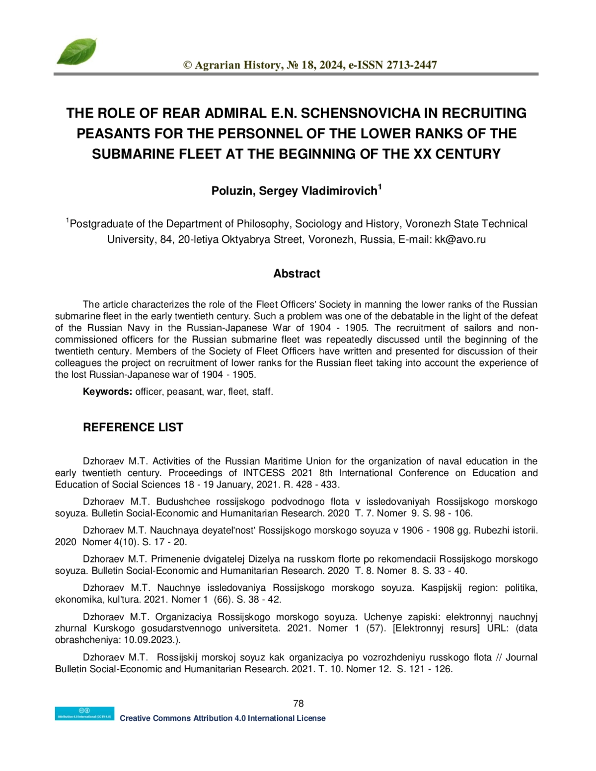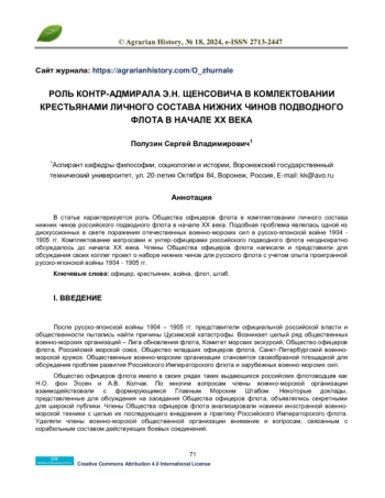 В статье характеризуется роль Общества офицеров флота в комплектовании личного состава нижних чинов российского подводного флота в начале ХХ века. Подобная проблема являлась одной из дискуссионных в свете поражения отечественных военно-морских сил в русско-японской войне 1904 - 1905 гг. Комплектование матросами и унтер-офицерами российского подводного флота неоднократно обсуждалось до начала ХХ века. Члены Общества офицеров флота написали и представили для обсуждения своих коллег проект о наборе нижних чинов для русского флота с учетом опыта проигранной русско-японской войны 1904 - 1905 гг.