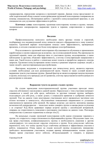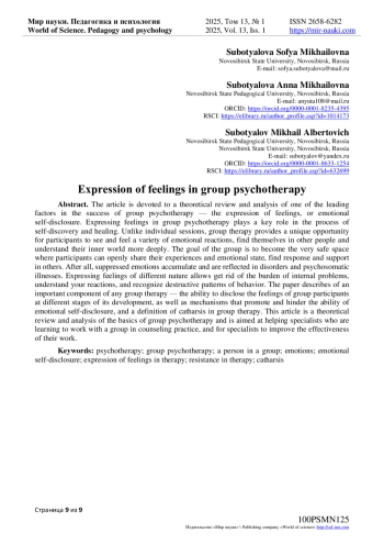 Статья посвящена теоретическому обзору и анализу одного из ведущих факторов успешности групповой психотерапии - выражению чувств, или же эмоциональному самораскрытию. Выражение чувств в групповой психотерапии играет ключевую роль в процессе самопознания и исцеления. В отличие от индивидуальных сессий групповая терапия предоставляет уникальную возможность для участников увидеть и ощутить разнообразие эмоциональных реакций, найти в других людях самих себя и понять свой внутренний мир глубже. Цель группы - стать тем самым безопасным пространством, где участники смогут открыто делиться своими переживаниями и эмоциональным состоянием, найти отклик и поддержку в других. Ведь подавленные эмоции накапливаются и находят свое отражение в расстройствах и психосоматических болезнях. Выражение чувств разного характера позволяет освободиться от груза внутренних проблем, понять свои реакции, распознать деструктивные паттерны поведения. В работе представлено описание важной составляющей любой групповой терапии - способности раскрытия чувств участников группы на разных стадиях ее развития, а также механизмы, способствующие и препятствующие способности эмоционального самораскрытия, определение катарсиса в групповой терапии. Данная статья представляет из себя теоретический обзор и анализ основ проведения групповой психотерапии и направлена на помощь специалистам, обучающимся работе с группой в консультационной практике, и для специалистов для улучшения эффективности работы.