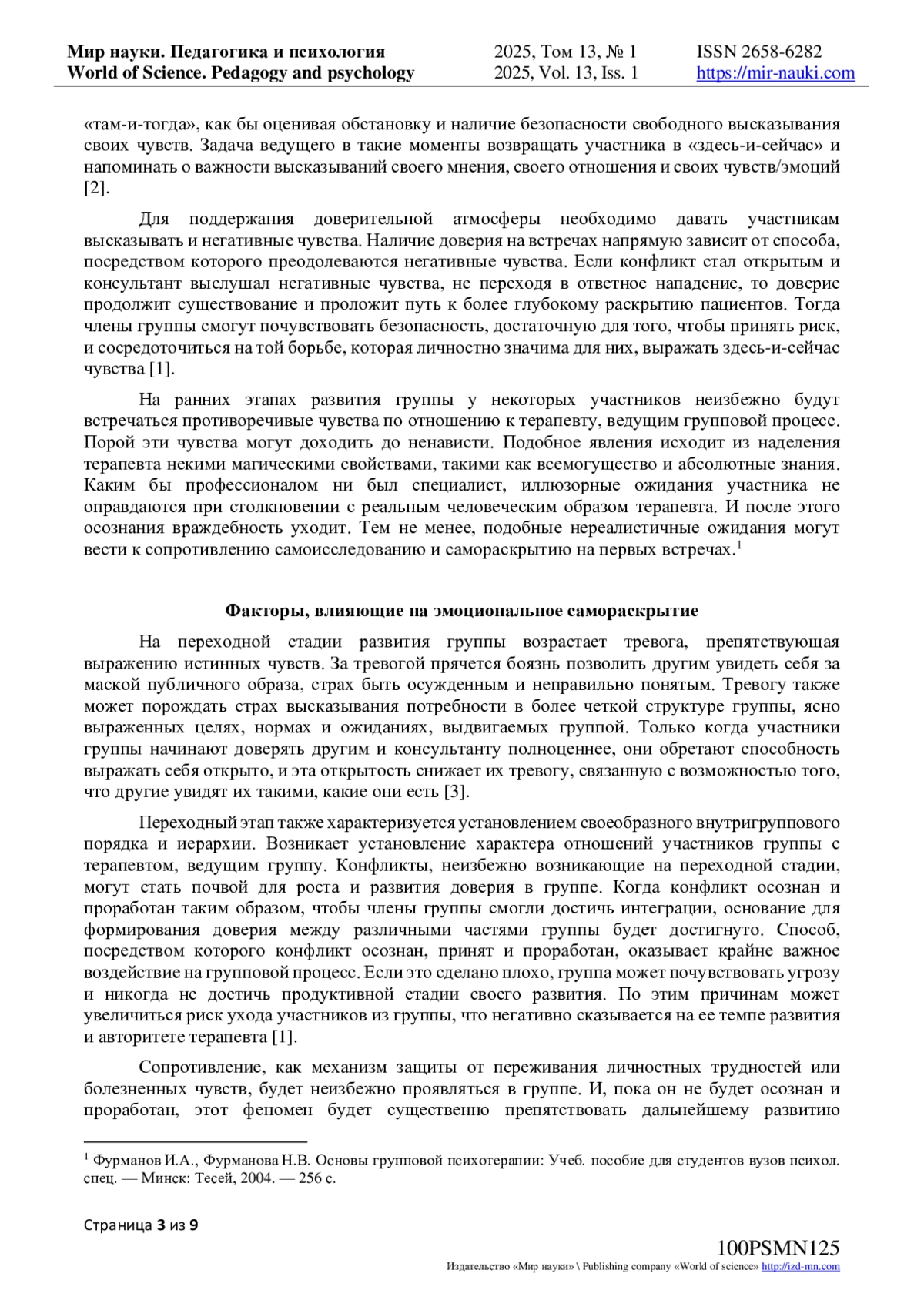 6. Смирнова И.Д. Сопротивление в индивидуальной и в групповой психотерапии // Человеческий фактор: Социальный психолог. - 2023. - № 2(46). - С. 89-97. EDN: OVJZEF