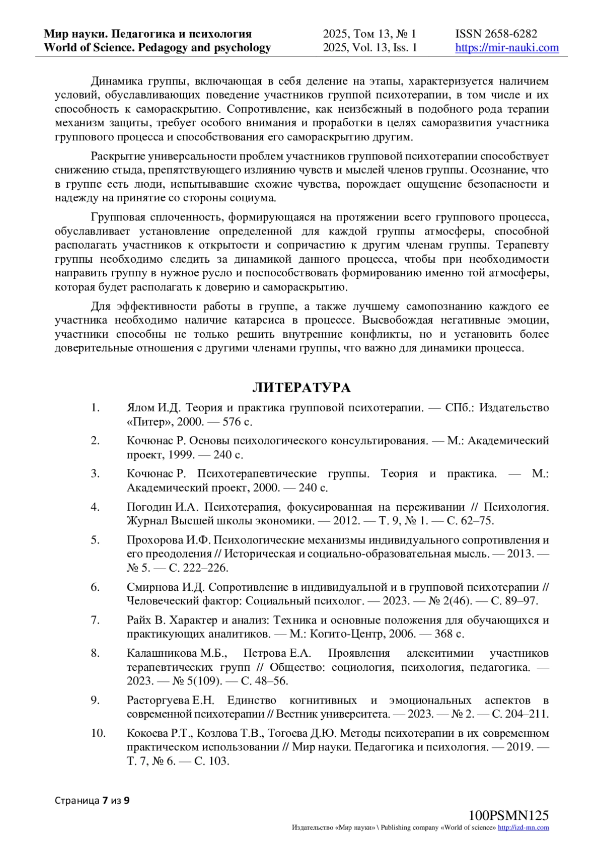 10. Кокоева Р.Т., Козлова Т.В., Тогоева Д.Ю. Методы психотерапии в их современном практическом использовании // Мир науки. Педагогика и психология. - 2019. - Т. 7, № 6. - С. 103. EDN: XXLTKT