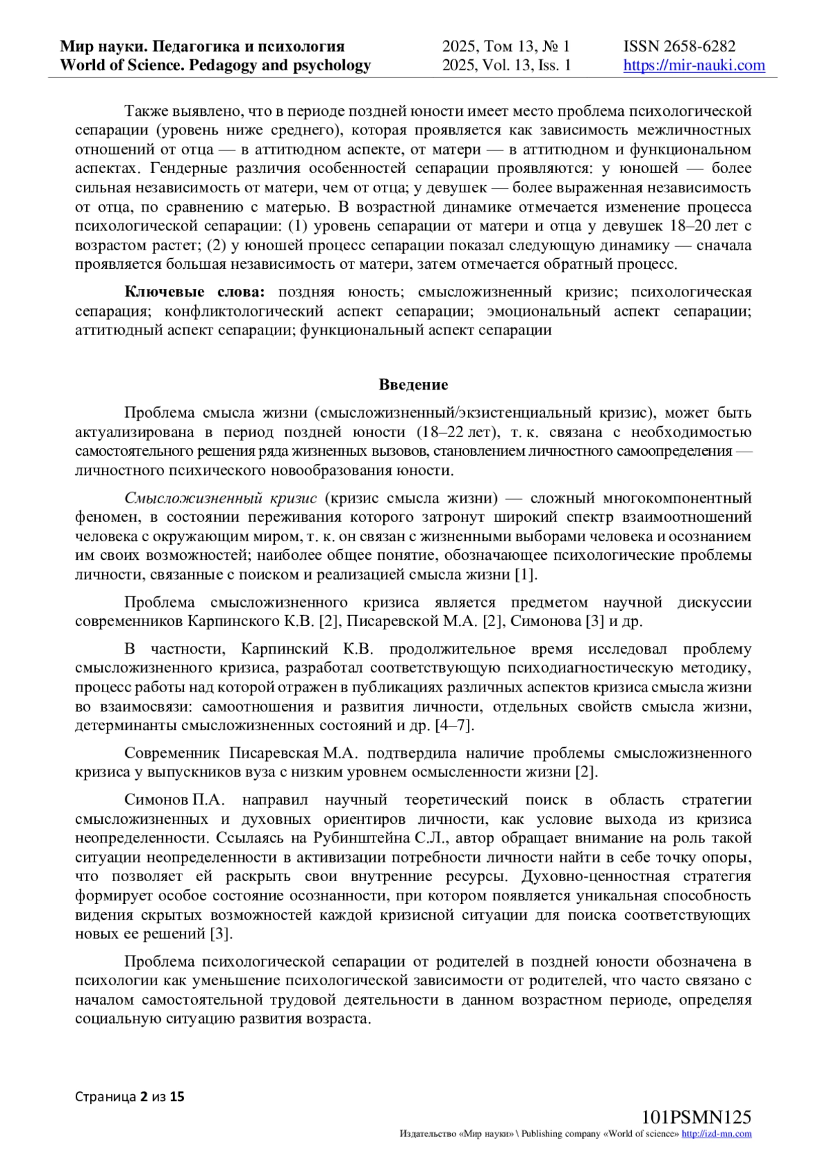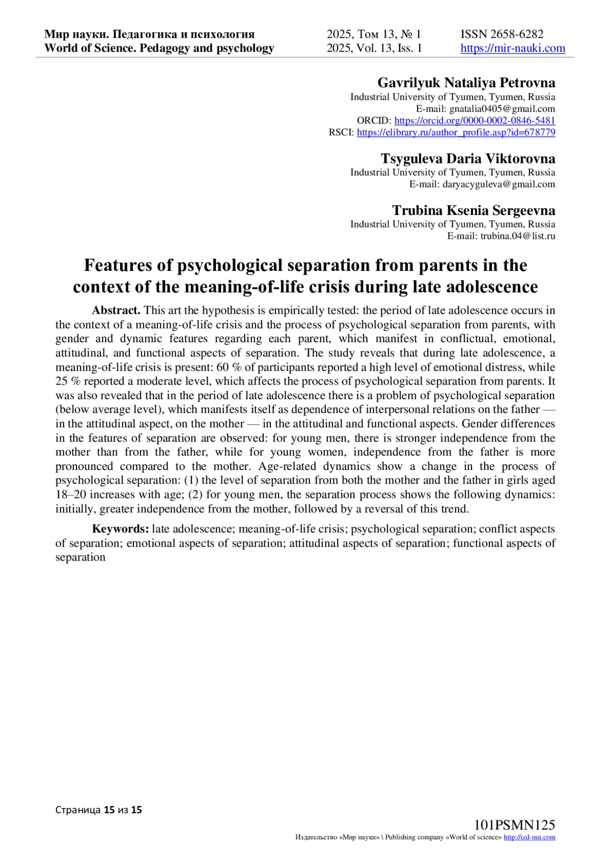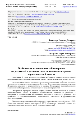 В статье исследуется проблема особенностей процесса психологической сепарации от родителей и смысложизненного кризиса в возрастном периоде поздней юности. Авторами представлено актуальное теоретическое осмысление проблемы, проведено эмпирическое исследование в периоде поздней юности: (1) уровня смысложизненного кризиса, (2) аспектов сепарации от родителей (отца и матери), (3) гендерных различий динамики психологической сепарации как независимости от каждого из родителей. Эмпирически проверена гипотеза: период поздней юности протекает в условиях смысложизненного кризиса и процесса психологической сепарации от родителей, с гендерными и динамическими особенностями относительно каждого из родителей, что проявляется в конфликтологическом, эмоциональном, аттитюдном и функциональном аспектах сепарации. Выявлено, что в периоде поздней юности имеет место смысложизненный кризис - 60 % обнаружили высокий уровень переживаний, 25 % обнаружили умеренный уровень, что отражается на процессе психологической сепарации от родителей. Также выявлено, что в периоде поздней юности имеет место проблема психологической сепарации (уровень ниже среднего), которая проявляется как зависимость межличностных отношений от отца - в аттитюдном аспекте, от матери - в аттитюдном и функциональном аспектах. Гендерные различия особенностей сепарации проявляются: у юношей - более сильная независимость от матери, чем от отца; у девушек - более выраженная независимость от отца, по сравнению с матерью. В возрастной динамике отмечается изменение процесса психологической сепарации: (1) уровень сепарации от матери и отца у девушек 18-20 лет с возрастом растет; (2) у юношей процесс сепарации показал следующую динамику - сначала проявляется большая независимость от матери, затем отмечается обратный процесс.